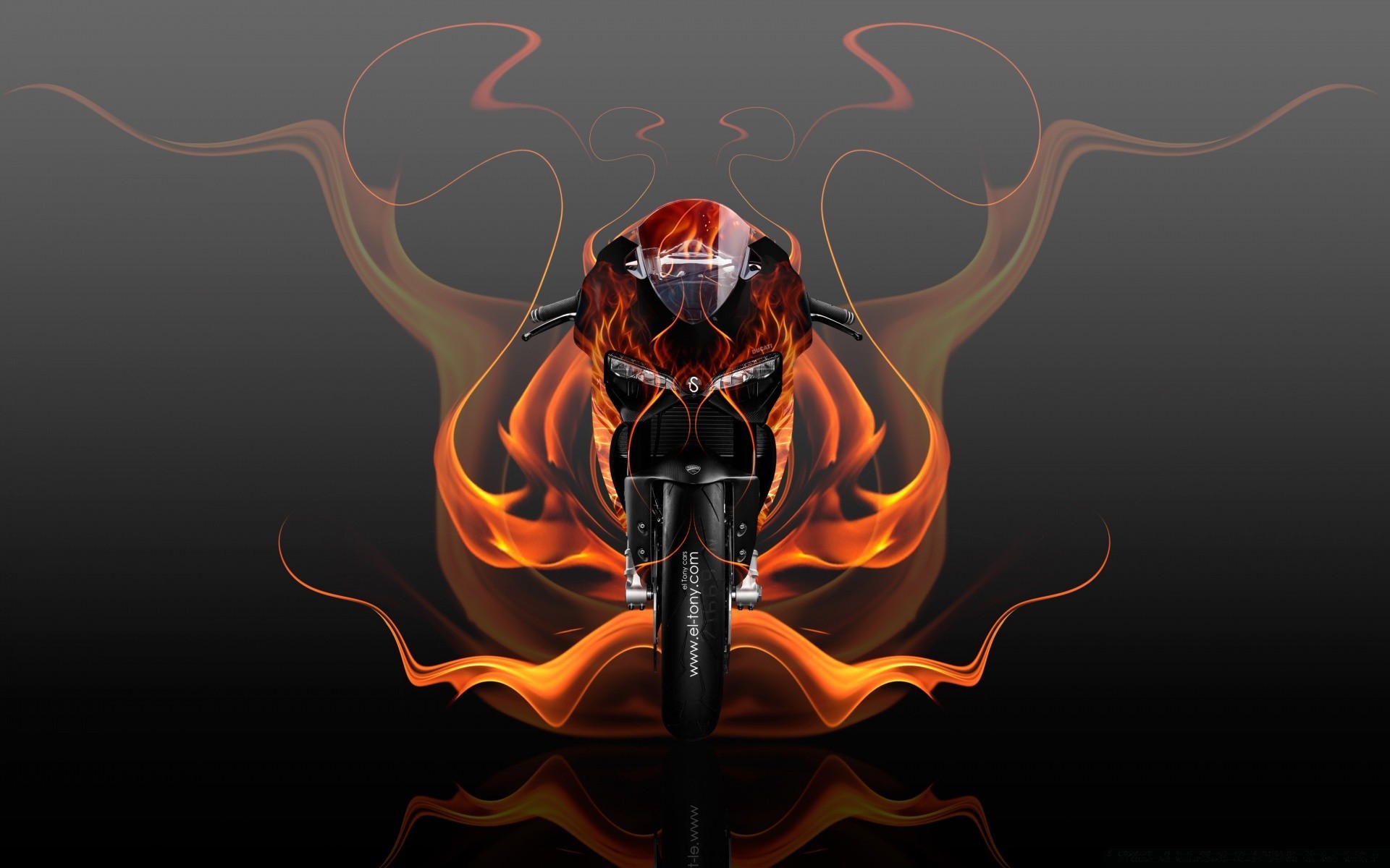 Leistungsstarke Motorrad mit abstrakten Flammenzungen auf grauem Hintergrund