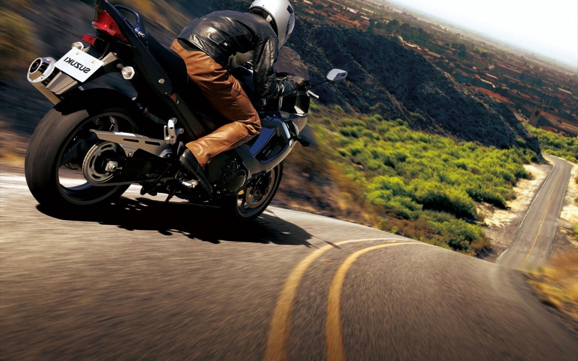 Ein Motorradfahrer trägt einen Helm auf einem Motorrad