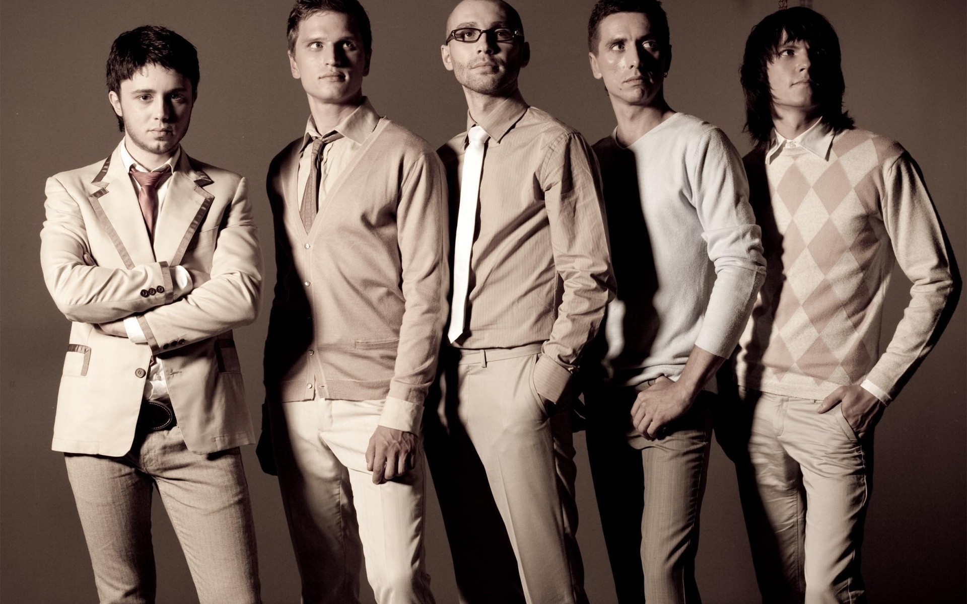 Eine fünfköpfige musikgruppe posiert vor der kameraEine fünfköpfige Musikgruppe posiert vor der Kamera