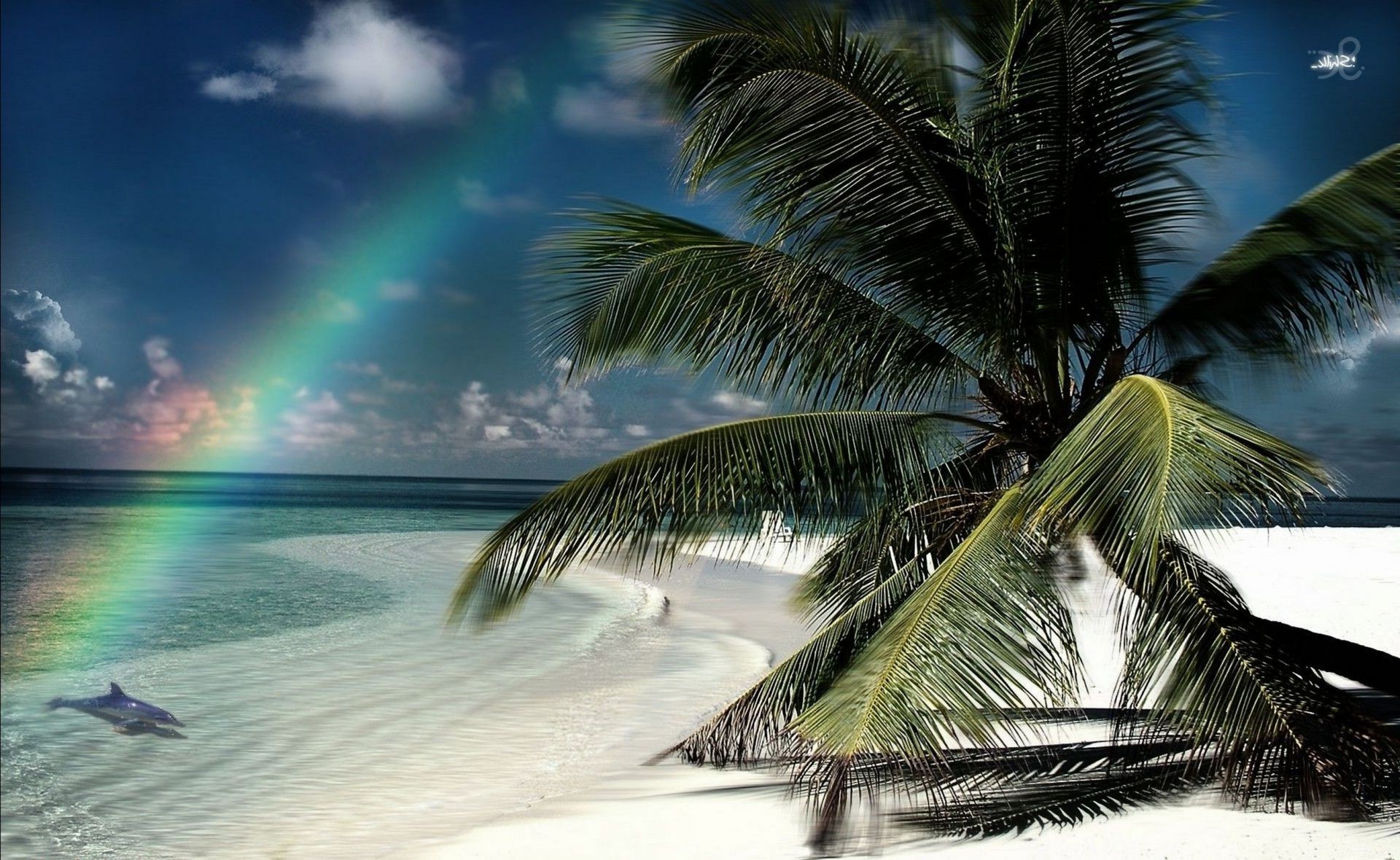 Tapete mit tropischem Strand, Ozean und Regenbogen von oben