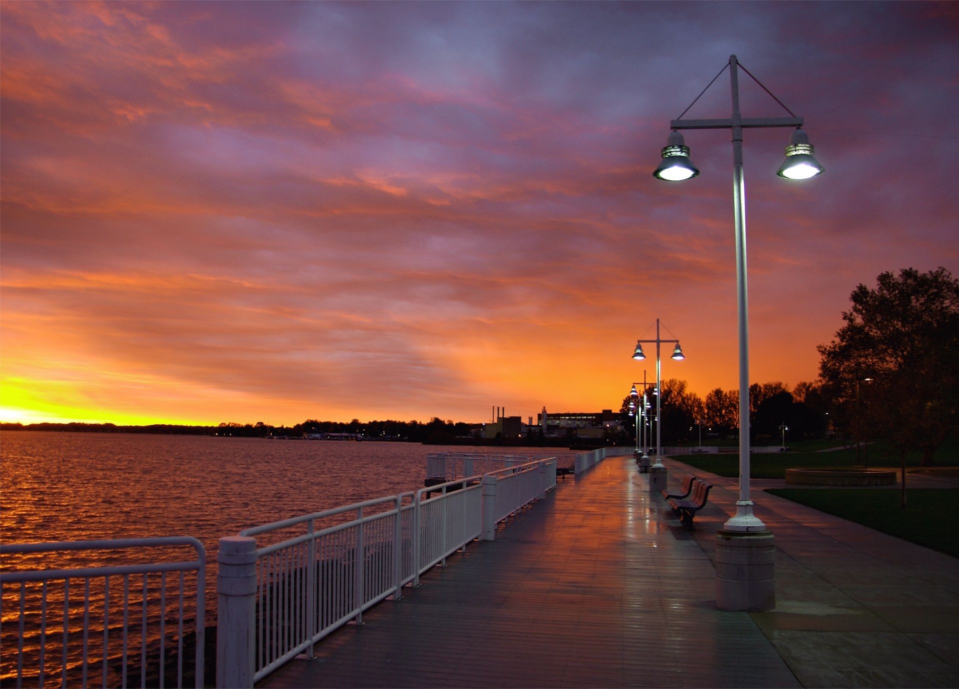 Promenade mit Laternen nach Regen im Morgengrauen