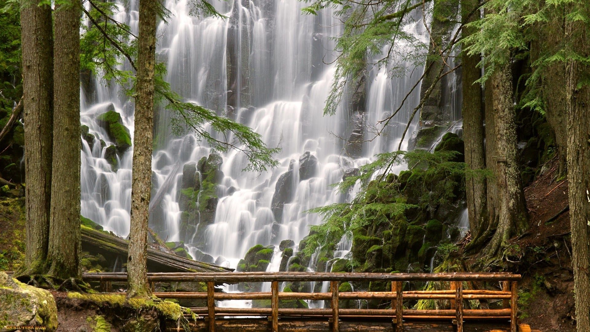 Holzbalkenbrücke vor dem Hintergrund eines Wasserfalls