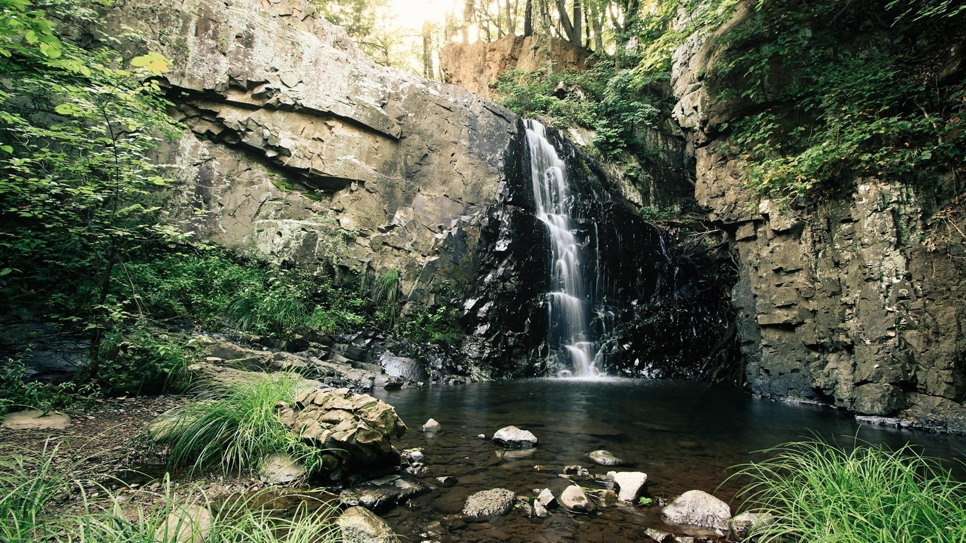Kiesstrand und ruhige, schwarzweiße Landschaft