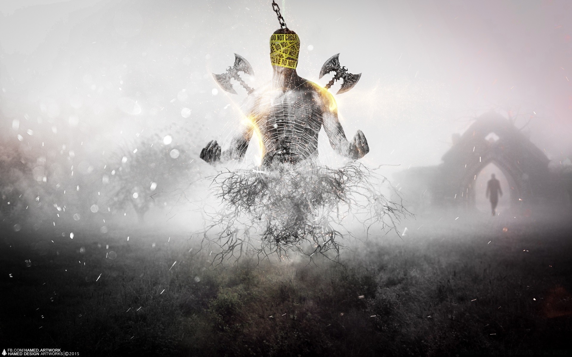 Gesichtsloser Krieger mit Äxten im Nebel