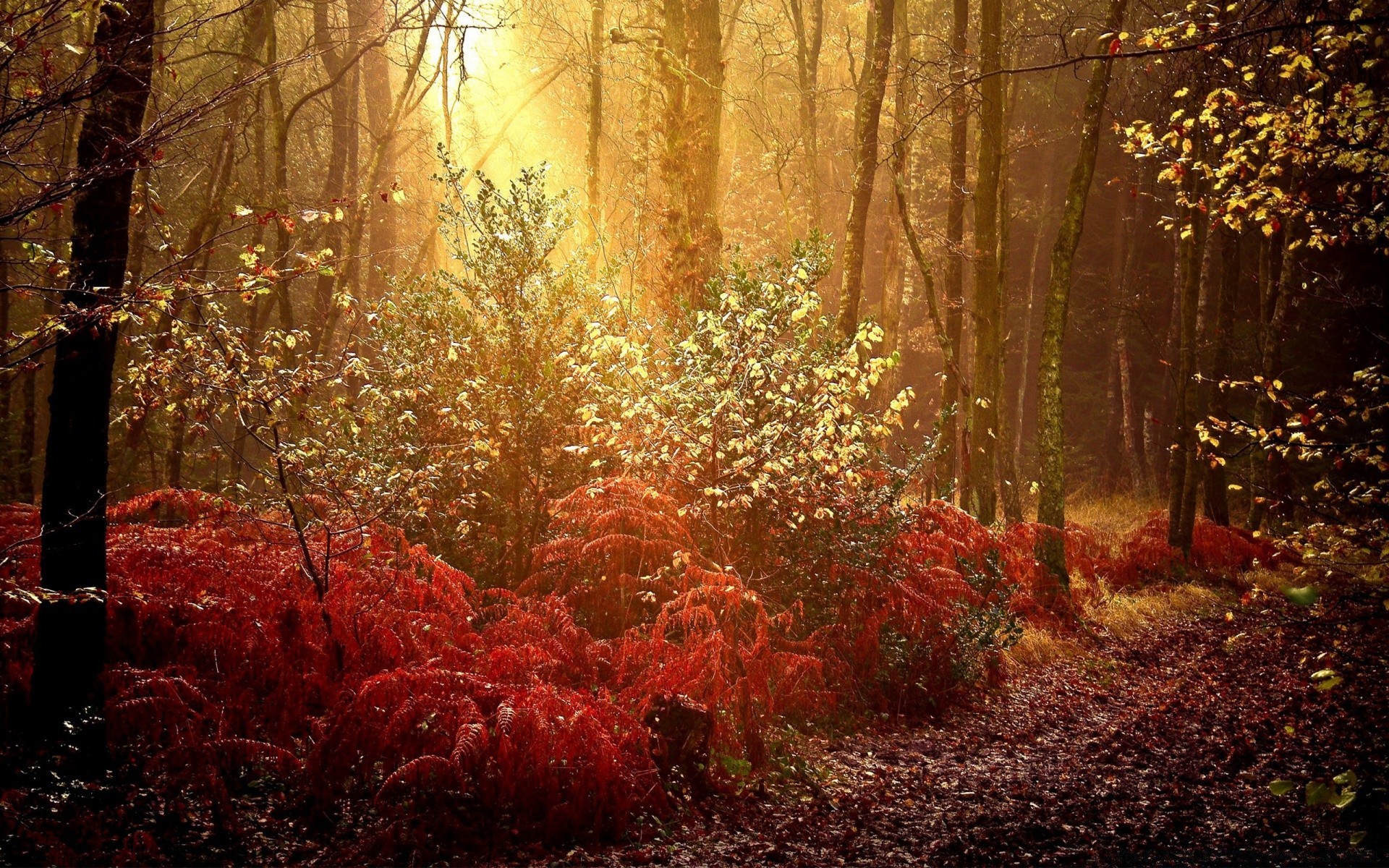 Das erwachen des herbstwaldes durch die sonnenstrahlen
