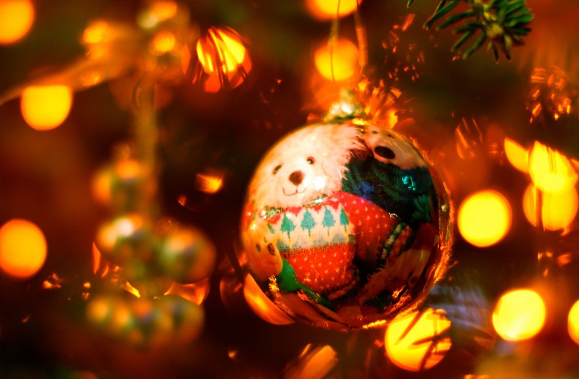 Silberne Kugel mit grünen Christbaumzweigen auf schwarzem Spiegel