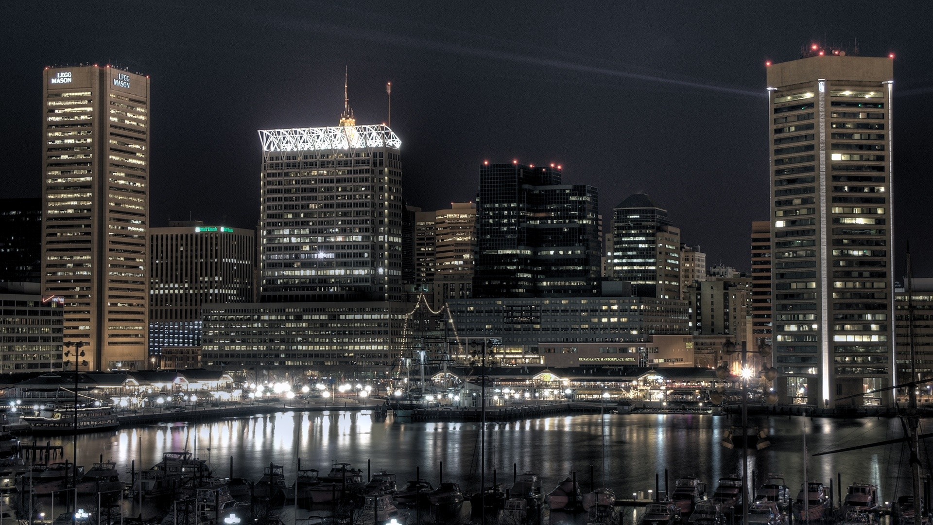 Innenstadt in Lichtern und Reflexion im Fluss
