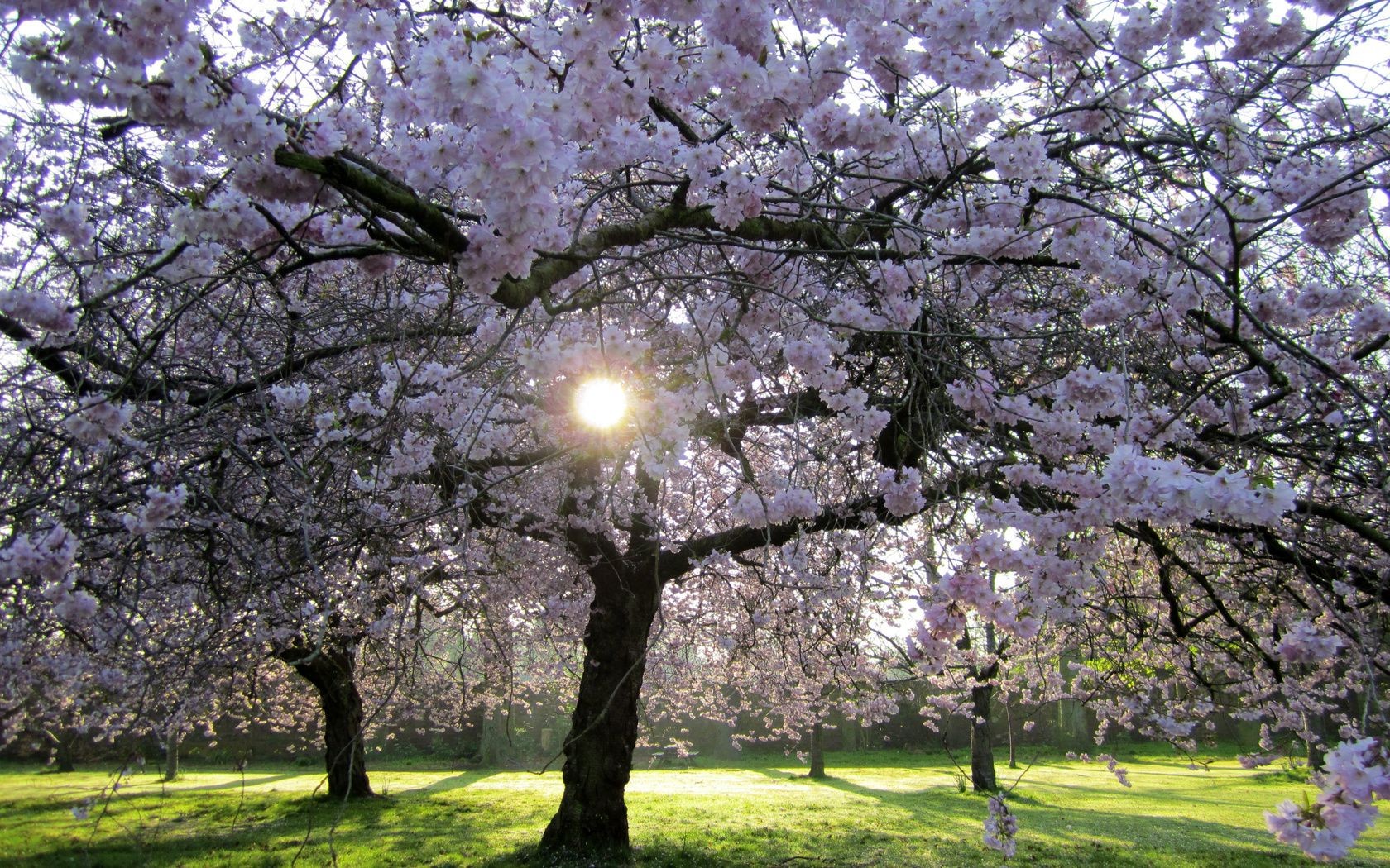 Blühende Sakura-Bäume auf einer grünen Lichtung