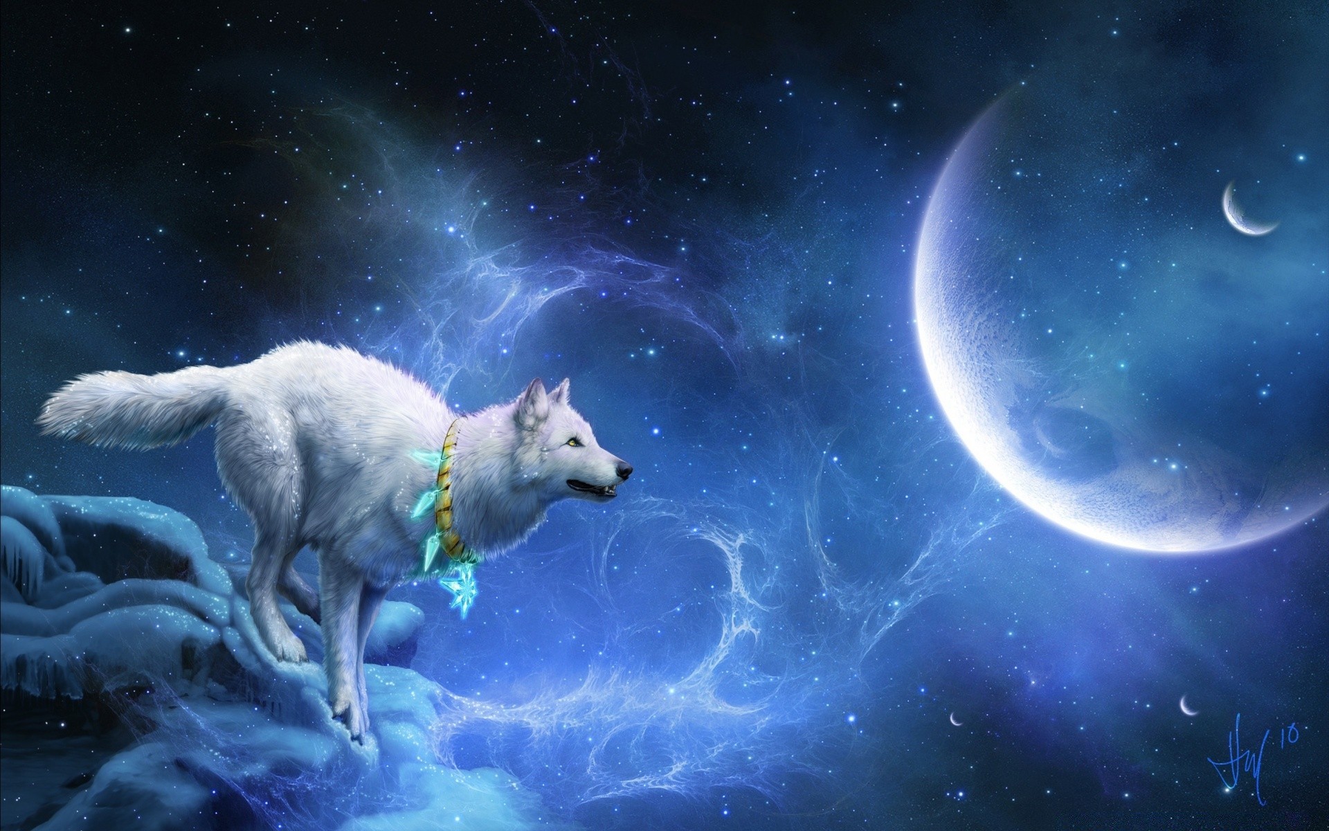 Weißer Wolf und Mond auf einem kosmischen Hintergrund im Fantasy-Stil