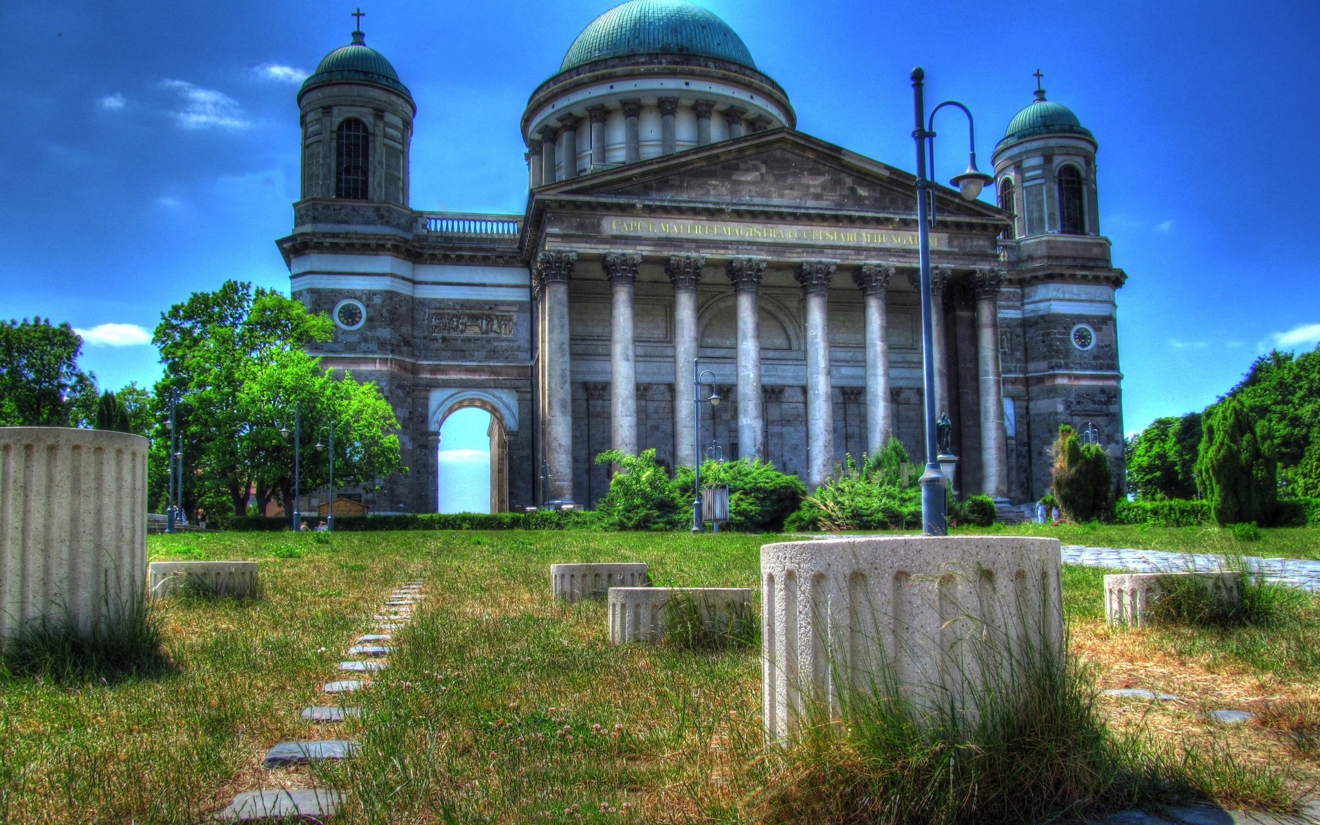 Europäische Kathedrale auf einem blauen Himmelshintergrund