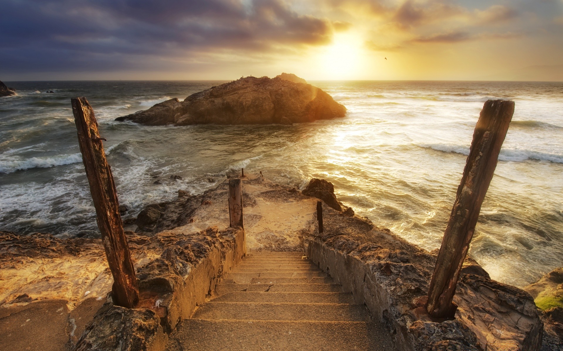 Strandabstieg durch die Treppe zum Meer bei Sonnenuntergang