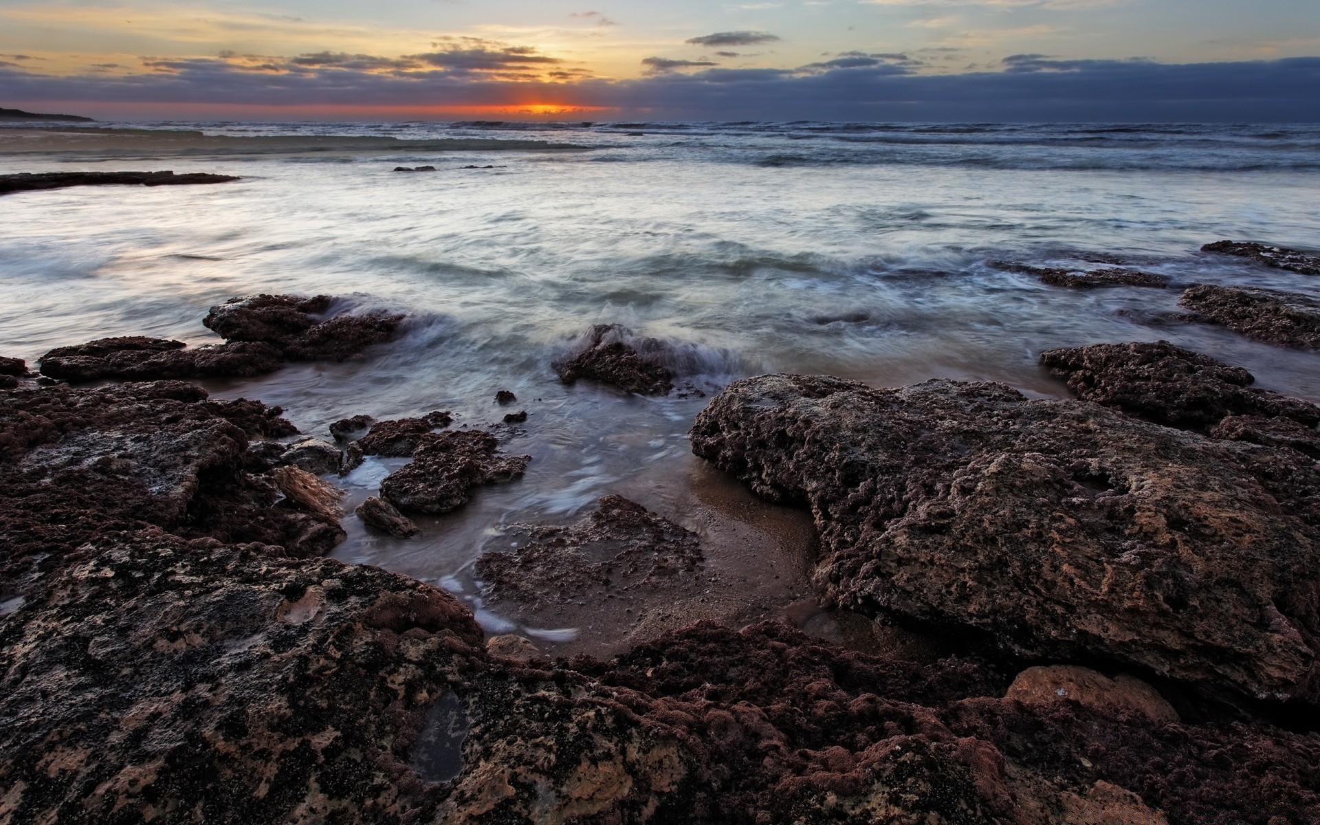 Die felsige Küste des Ozeans bei Sonnenuntergang