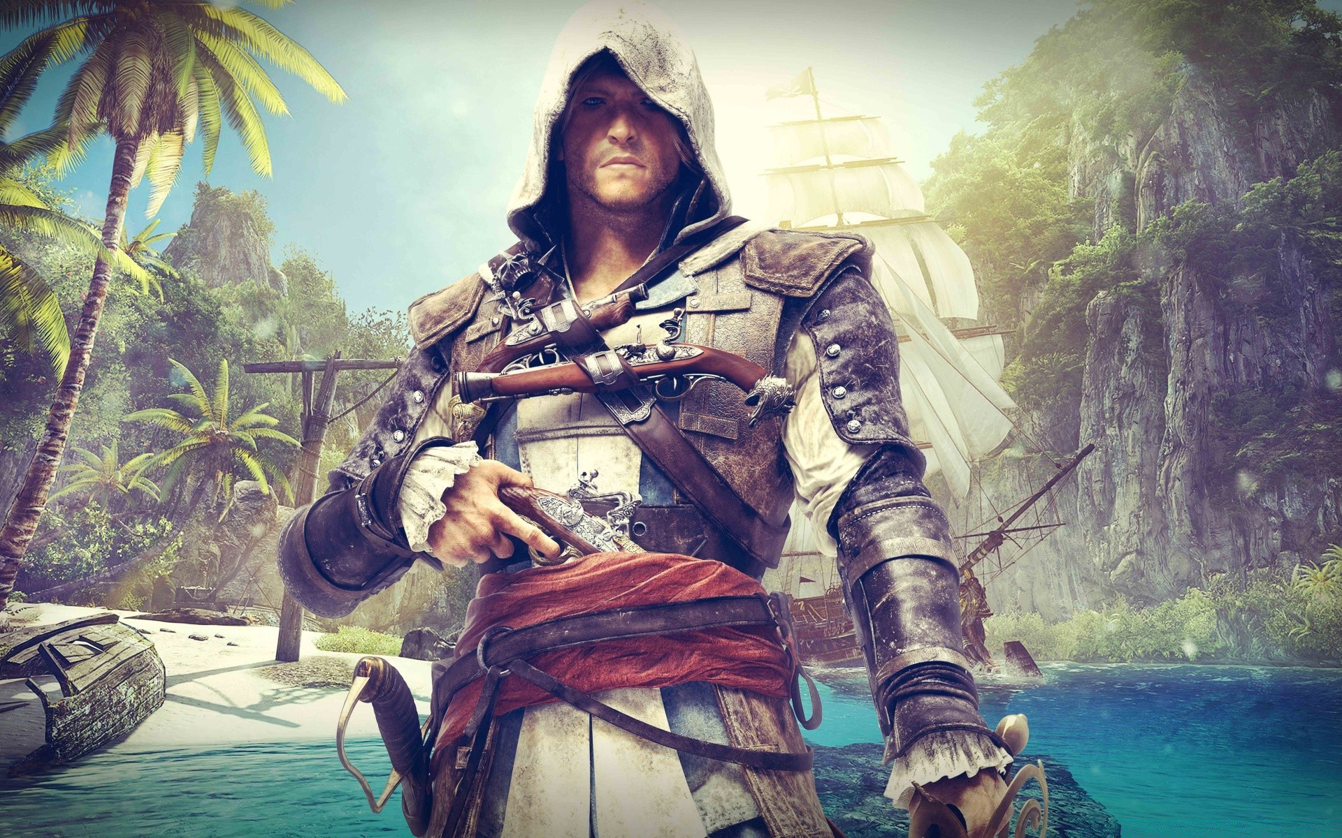 Assassin`s creed. Wanderer am Strand mit Palmen