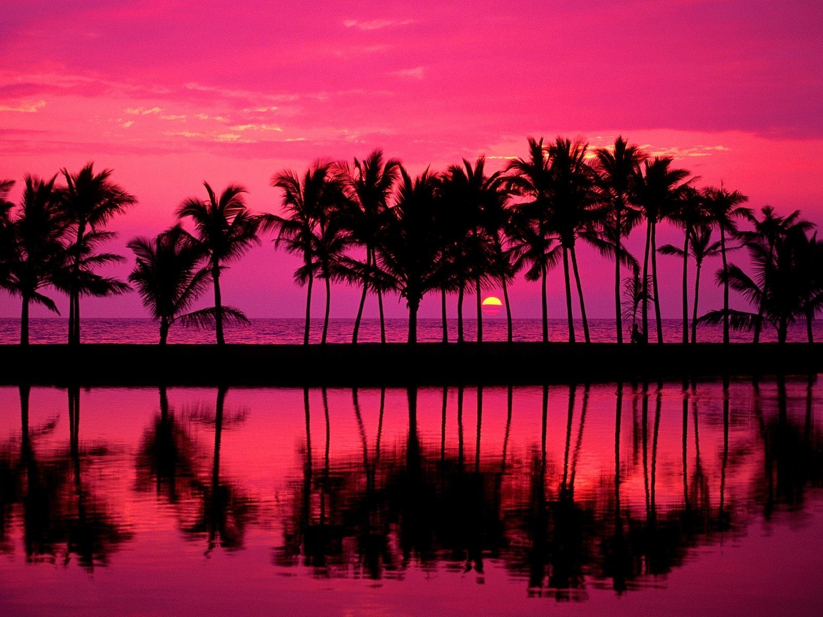 Palme vor dem Hintergrund des Strandes und des Sonnenuntergangs in orangefarbenen Tönen