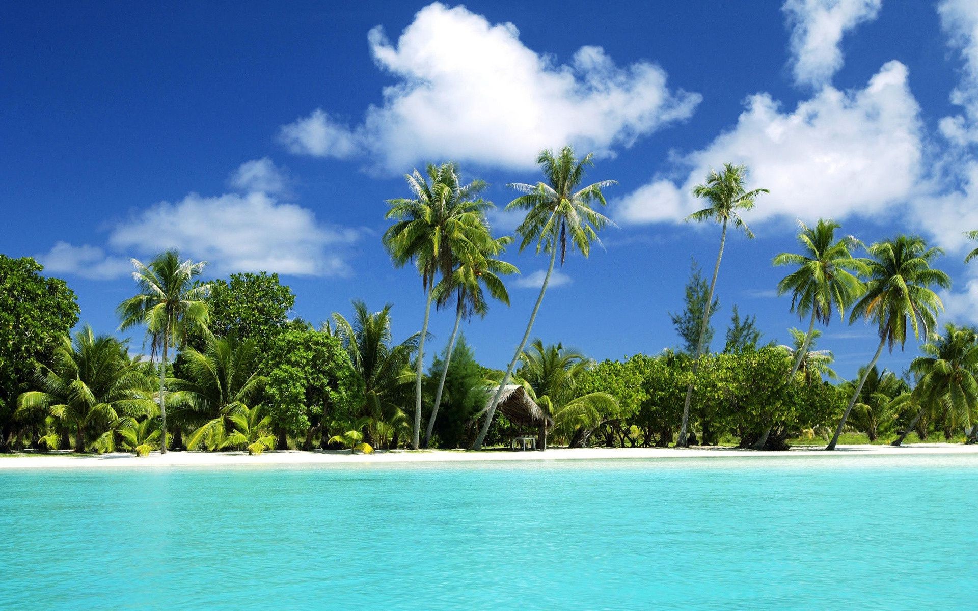Der Liner nähert sich den Ufern der Insel. Palmen und das Meer
