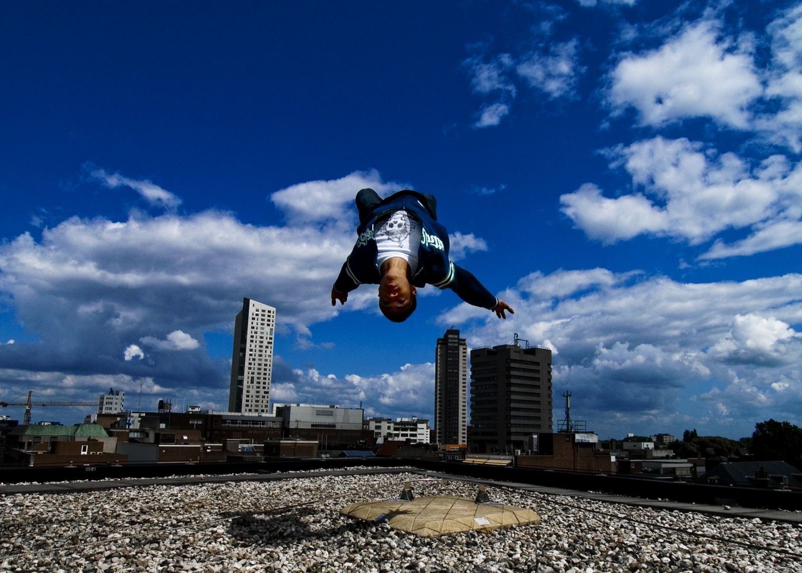 Ein Parkour-Typ führt einen backflip auf dem Dach aus