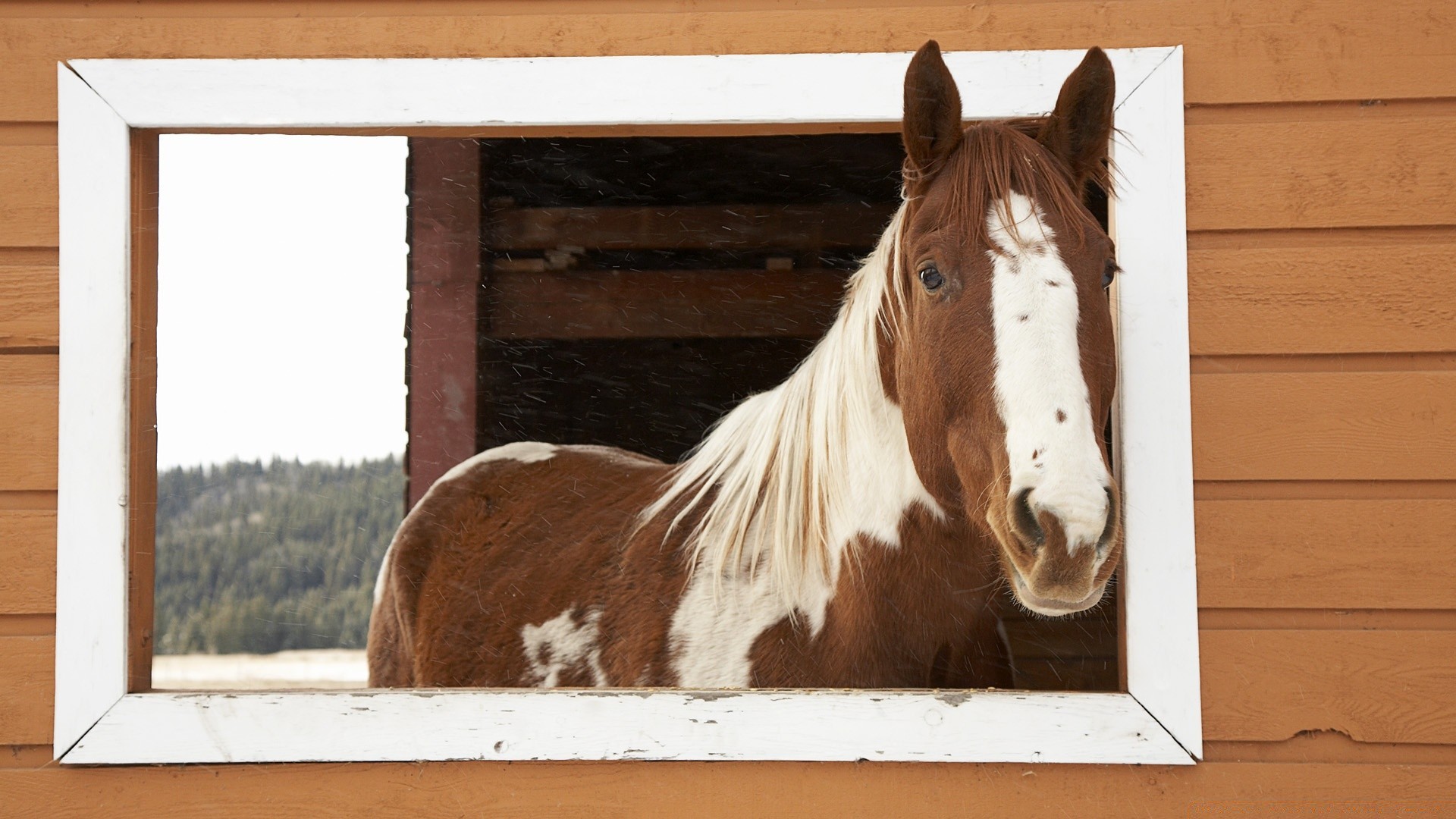 Pferd auf dem Bauernhof. Schöne Aussichten und Tiere