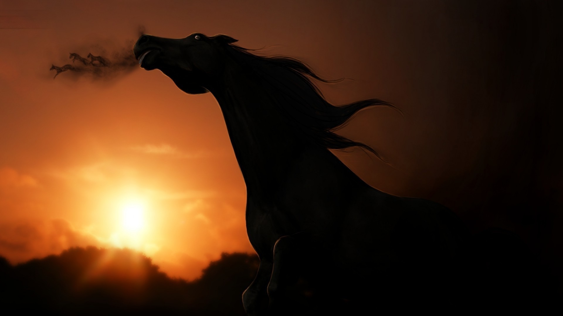 Silhouette eines Pferdes in Bewegung bei Sonnenuntergang