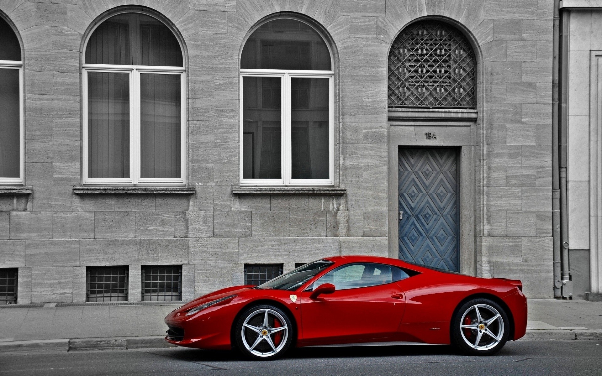 Rotes Auto auf der Straße vor Sonnenuntergang Hintergrund