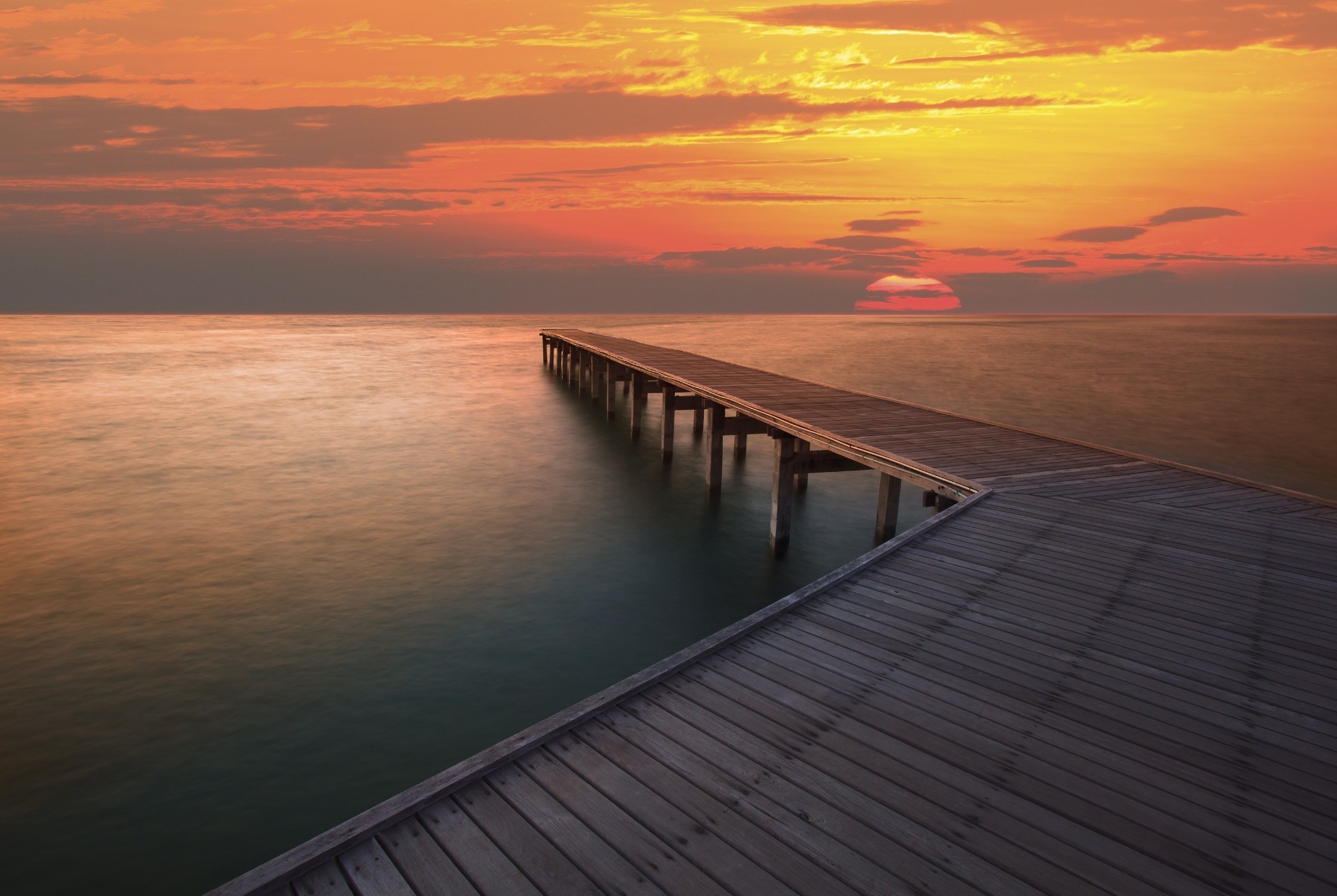 Blick auf den Sonnenuntergang vom Holzsteg am Meer