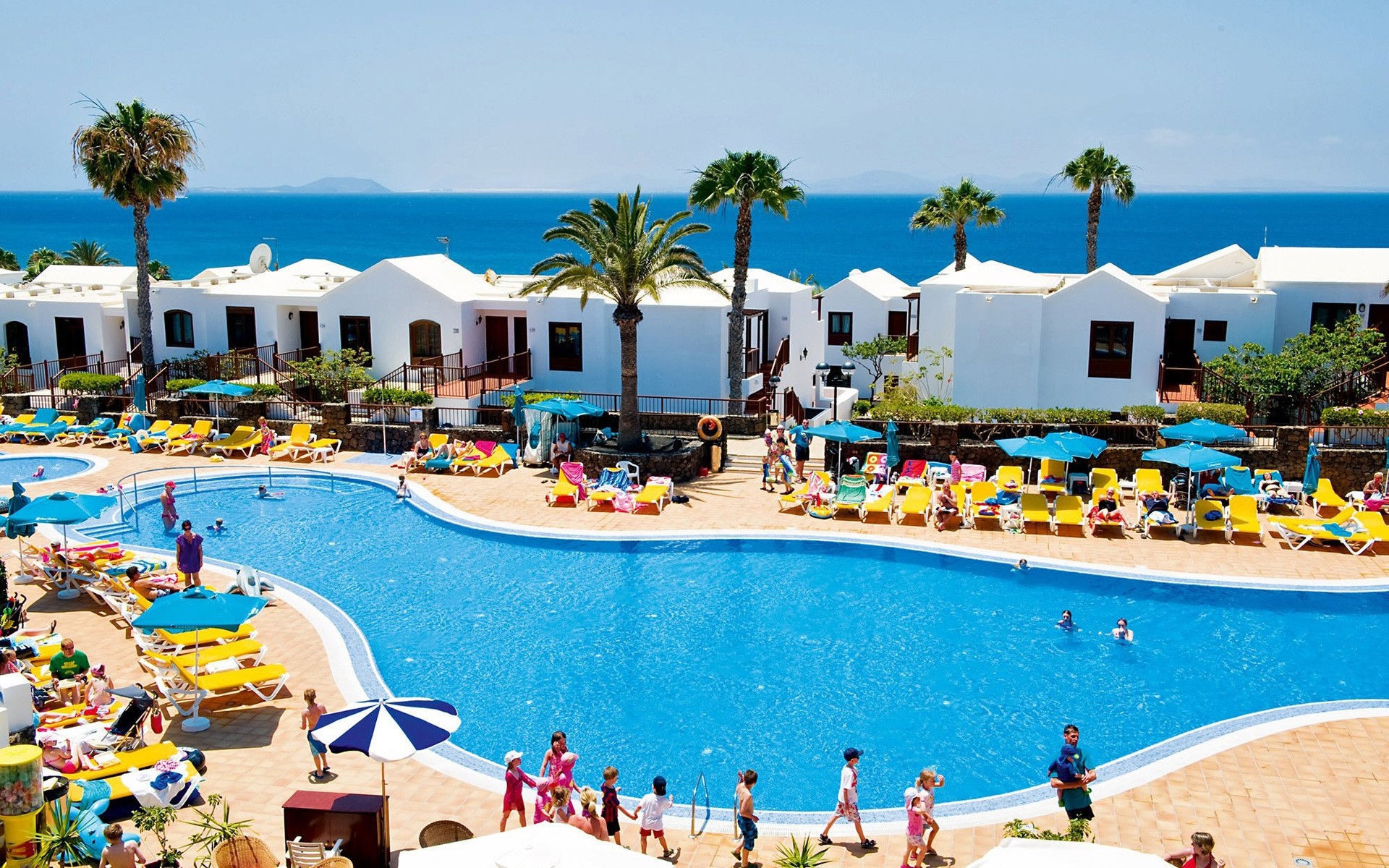 Ein langer Pool im Hotel mit Palmen