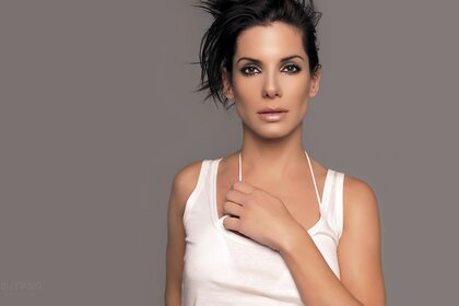 Lächelnde berühmte schauspielerin auf dem hintergrund des emblemsLächelnde berühmte Schauspielerin auf dem Hintergrund des Emblems