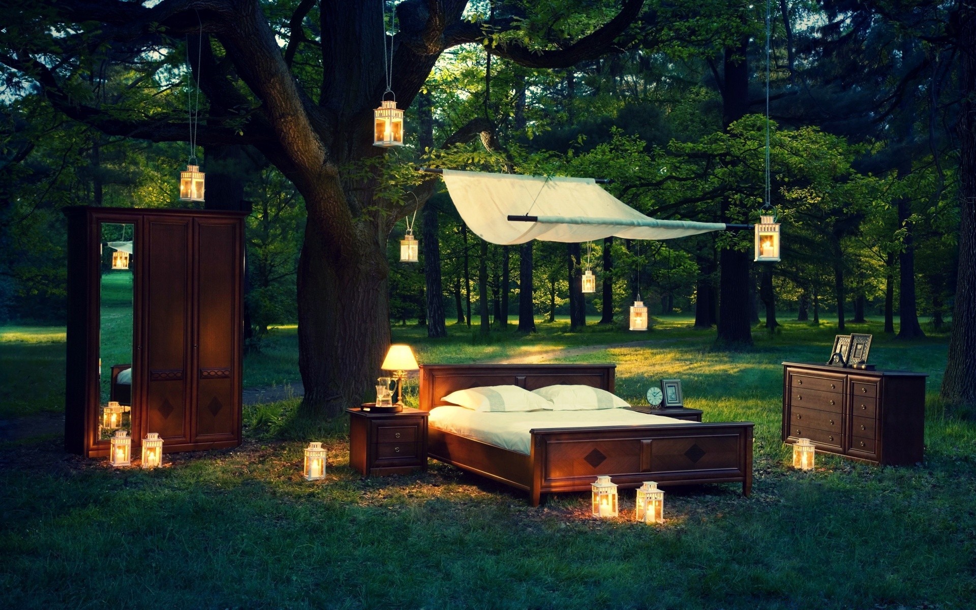 Ein schlafzimmer in der mitte einer waldlichtung geschaffenEin Schlafzimmer in der Mitte einer Waldlichtung geschaffen