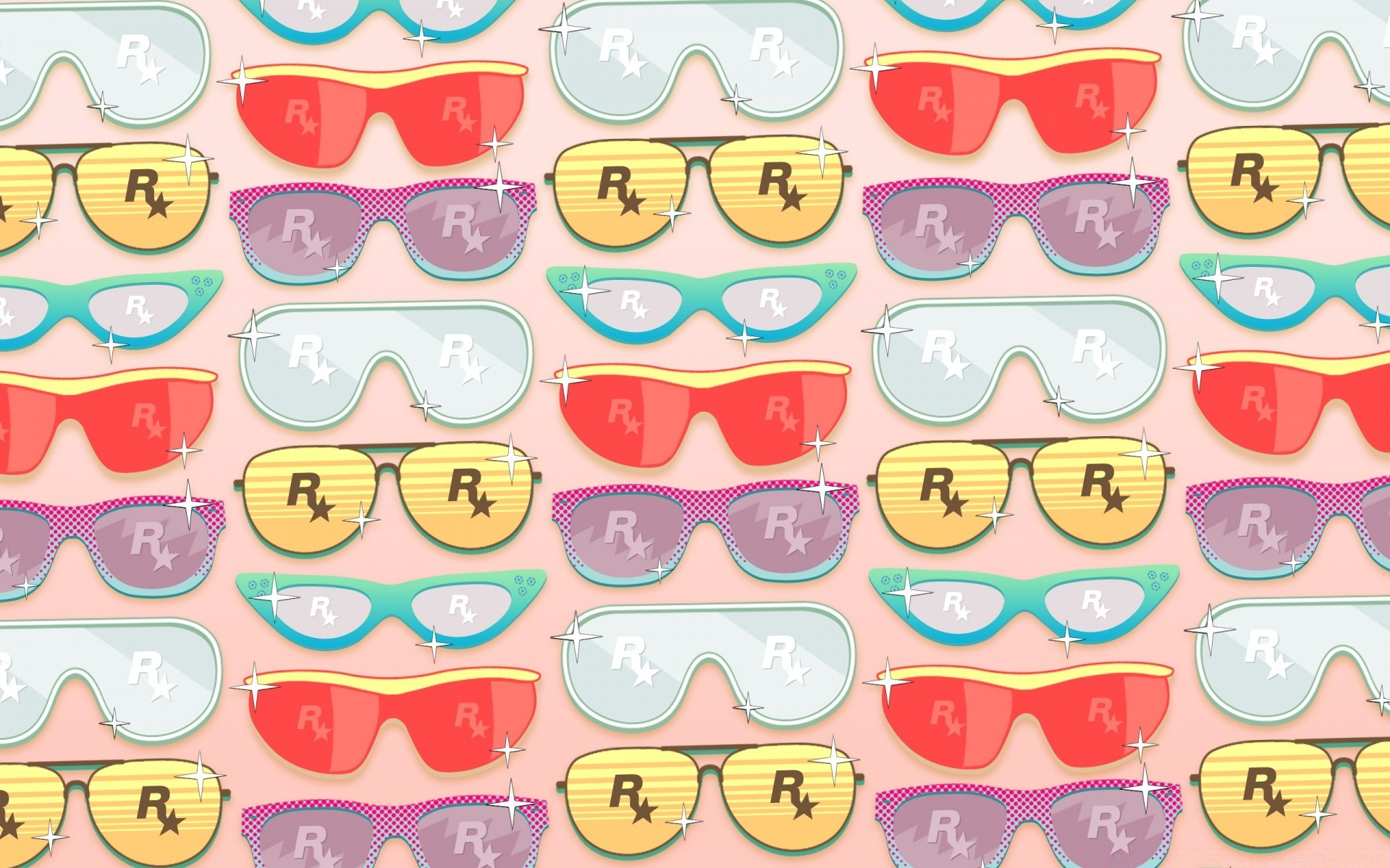 Eine Vielzahl von Brillen mit dem Rockstar Gameslogo auf den Linsen