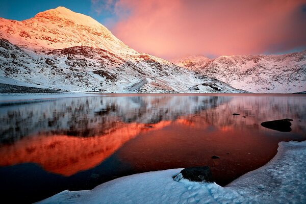 Schöne Landschaft. See. Die Berge. Schnee