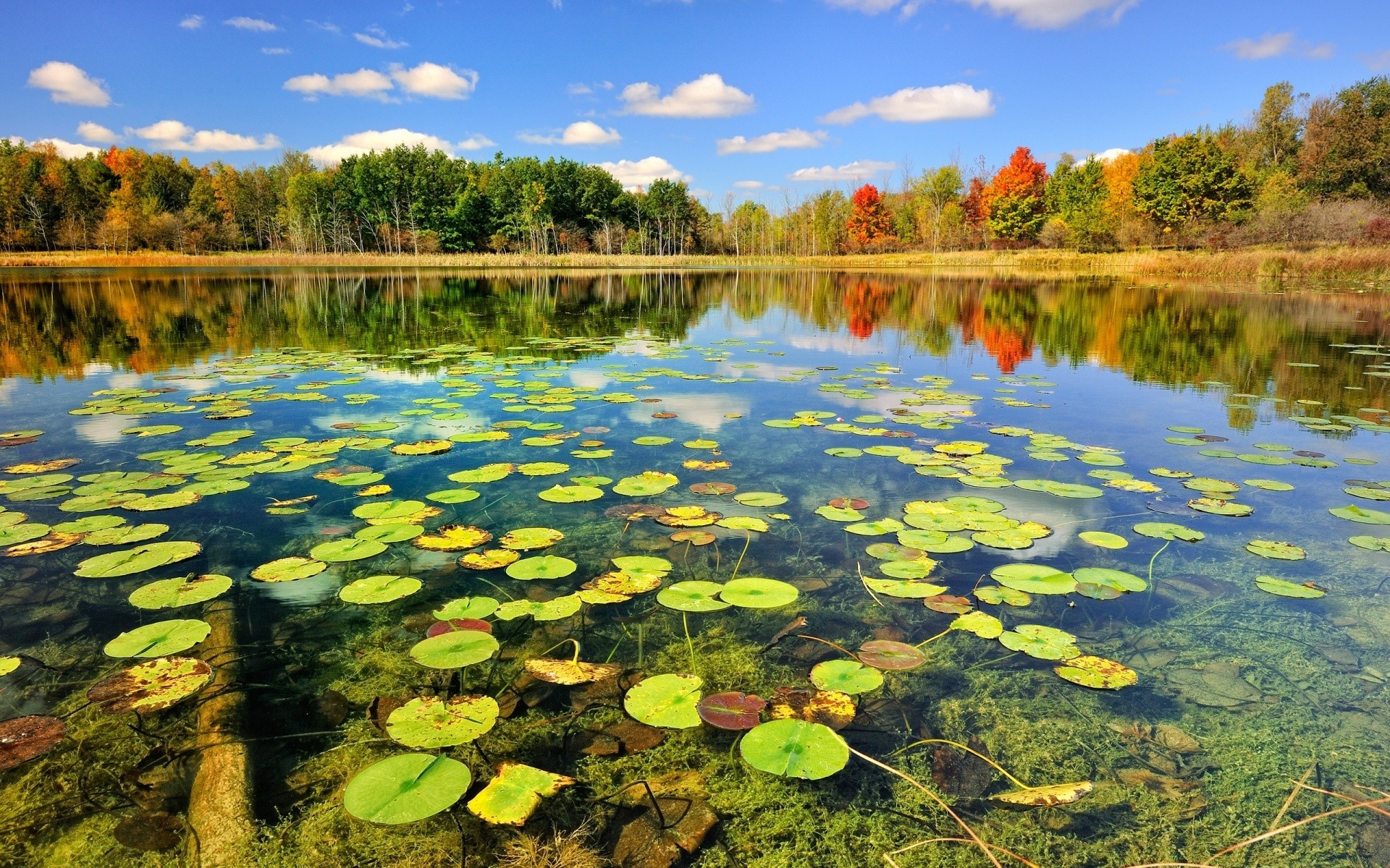 Ein fabelhafter teich, der von einem grünen wald umgeben istEin fabelhafter Teich, der von einem grünen Wald umgeben ist
