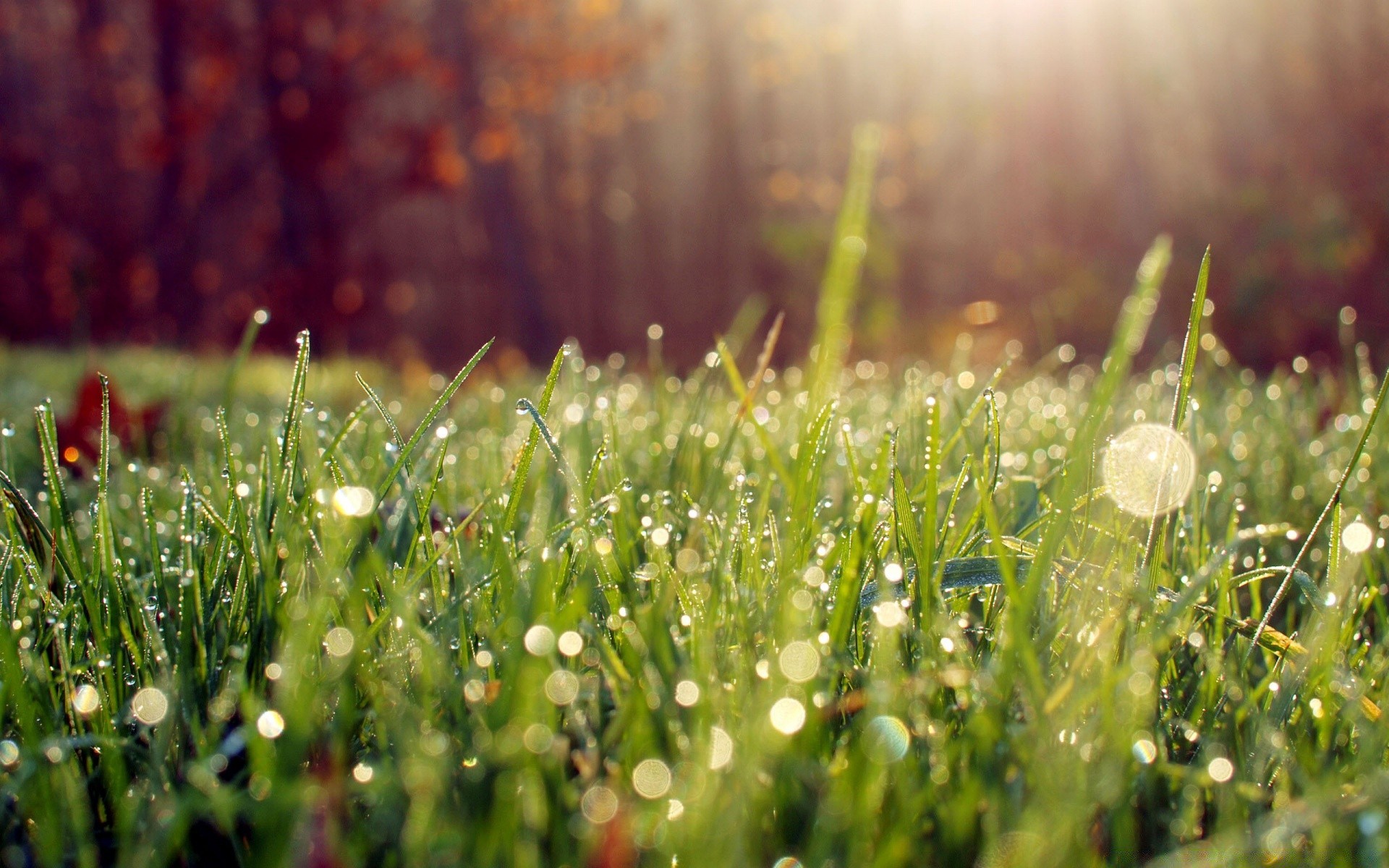 Schillernde Tautropfen auf dem Gras bei Tageslicht