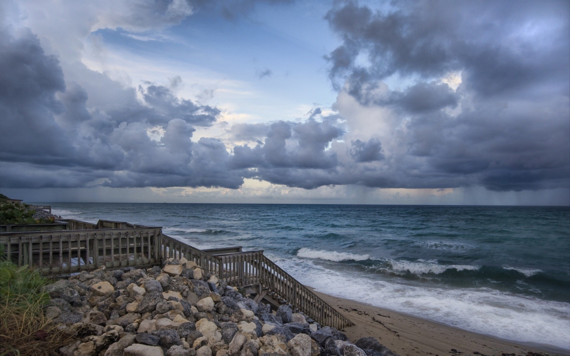 Wunderschöne Meereslandschaft mit Wellen, krümeligem Sand und abfallenden Steinen