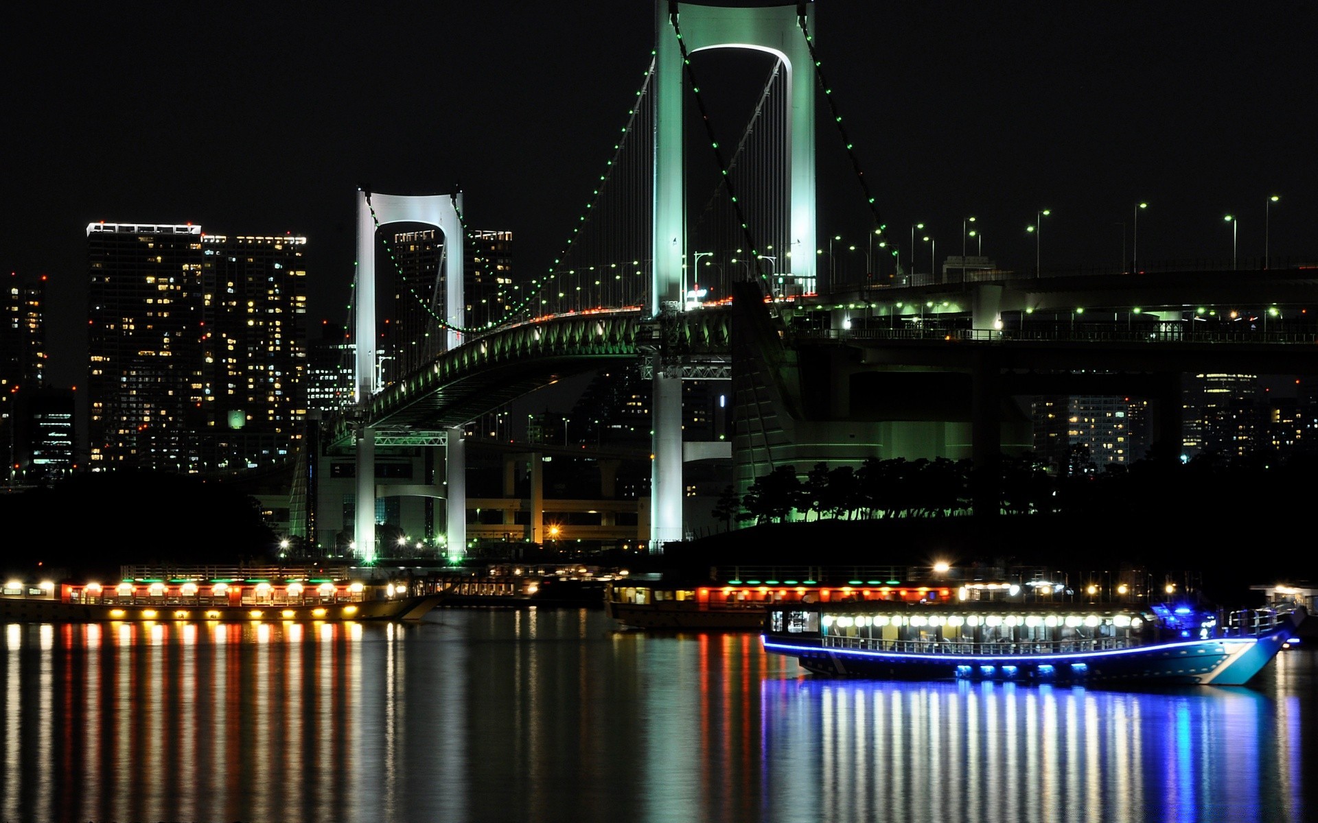 Architektonische Brücke im Hintergrund der Nachtstadt