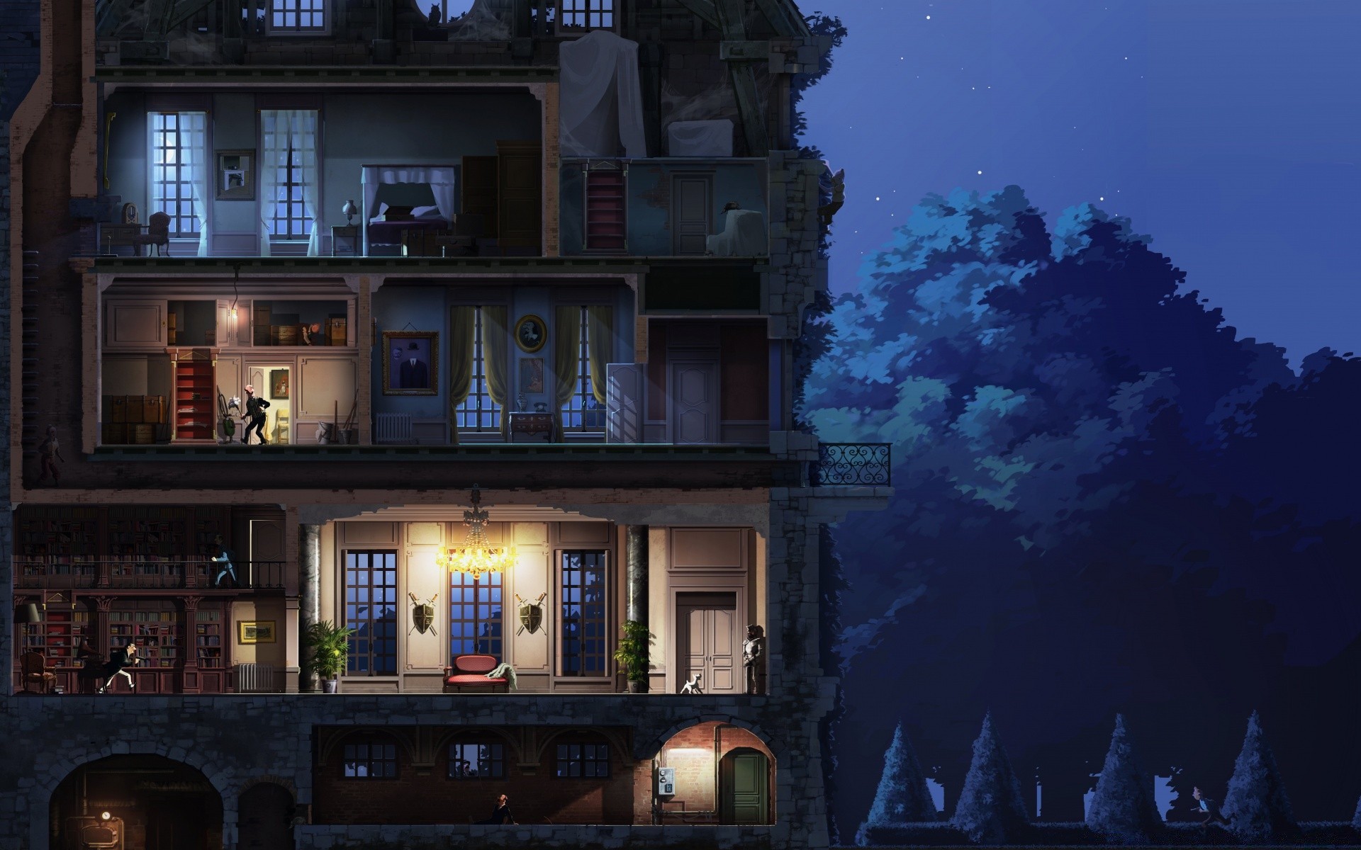 Computerspiel, Haus im Hintergrund des Waldes