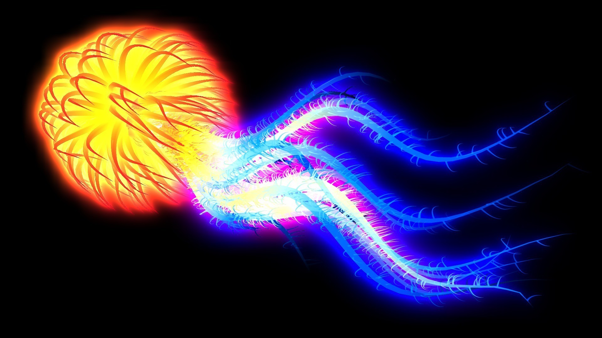 Ein Clown und ein Elefant fliegen in einem Ballon in Form eines Pilzes