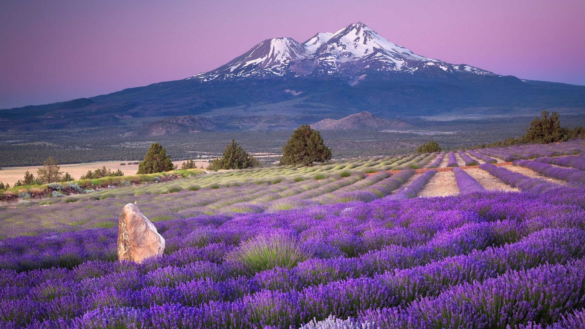 Blick auf den Berg mit einem rosa Sonnenuntergang