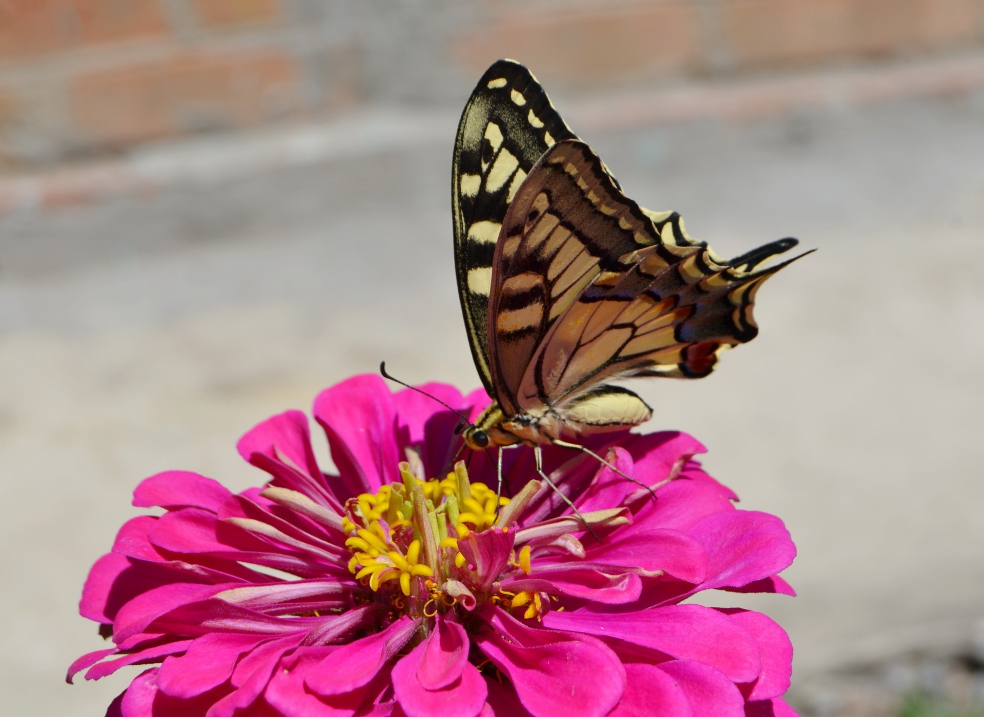 Ein orangefarbener Schmetterling sitzt auf einer rosa Blume