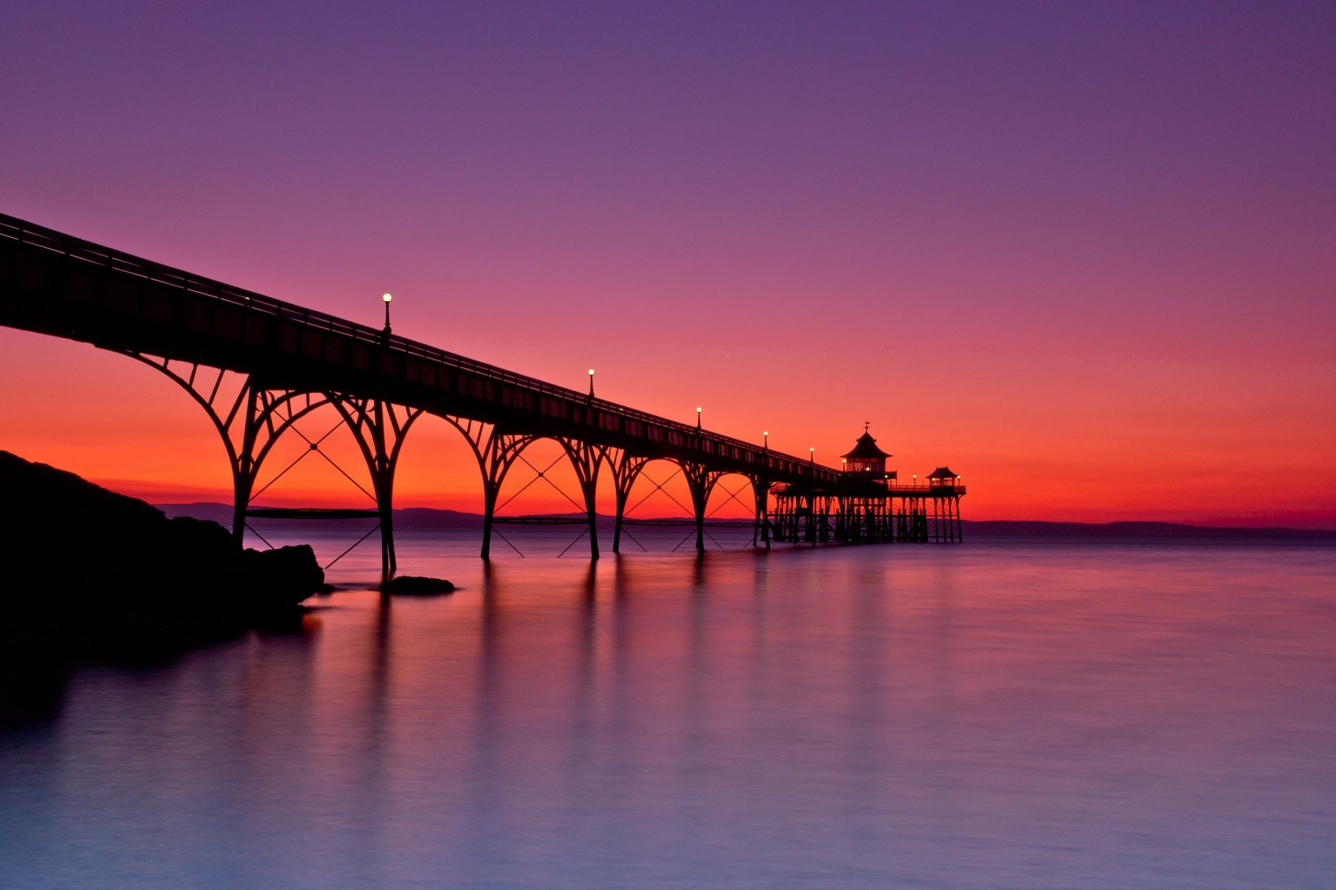 Brücke in der Ferne und Wellen auf einem rosa und blauen Himmelshintergrund