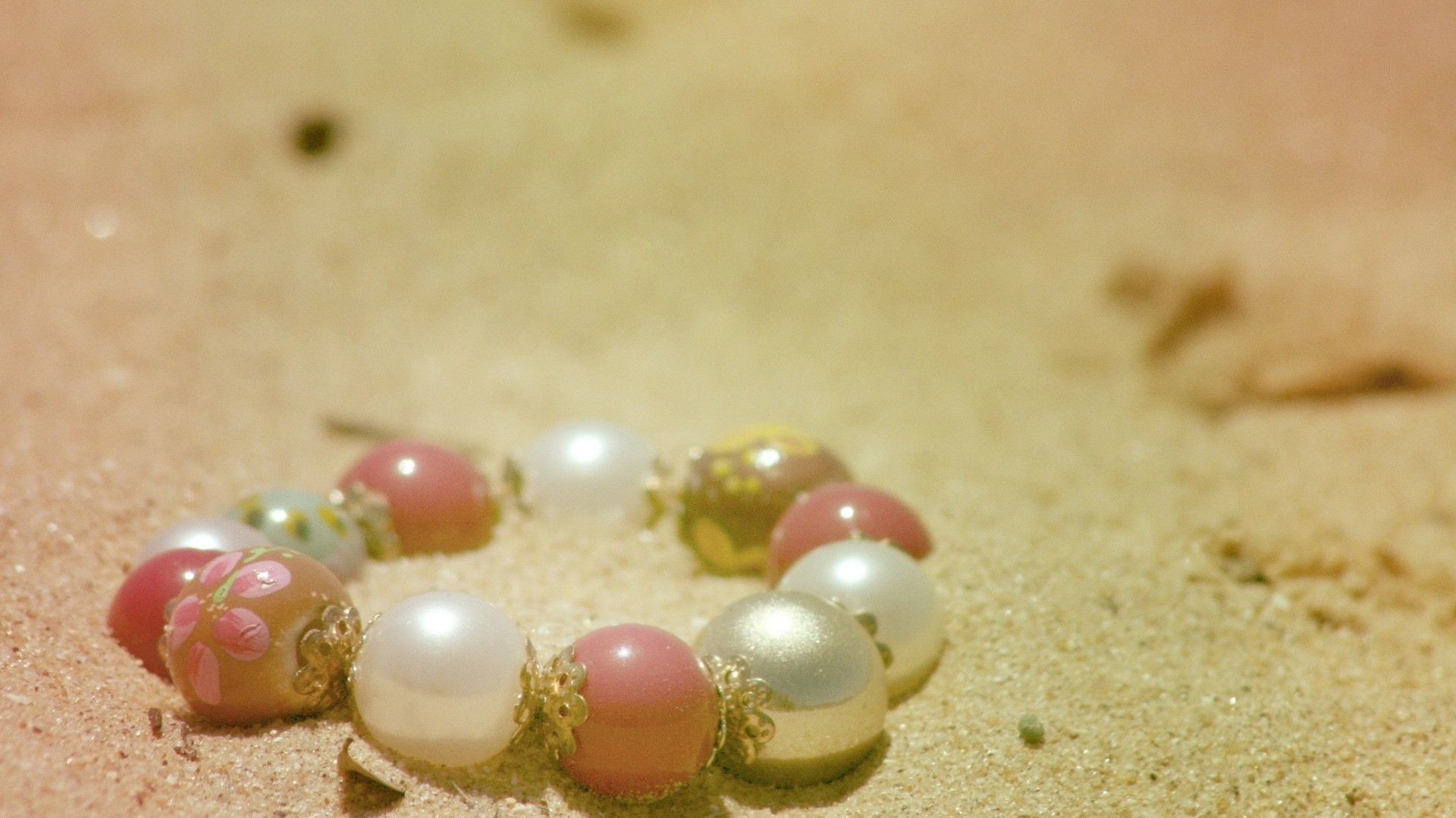 Armband aus weißen und rosa Perlen im Sand