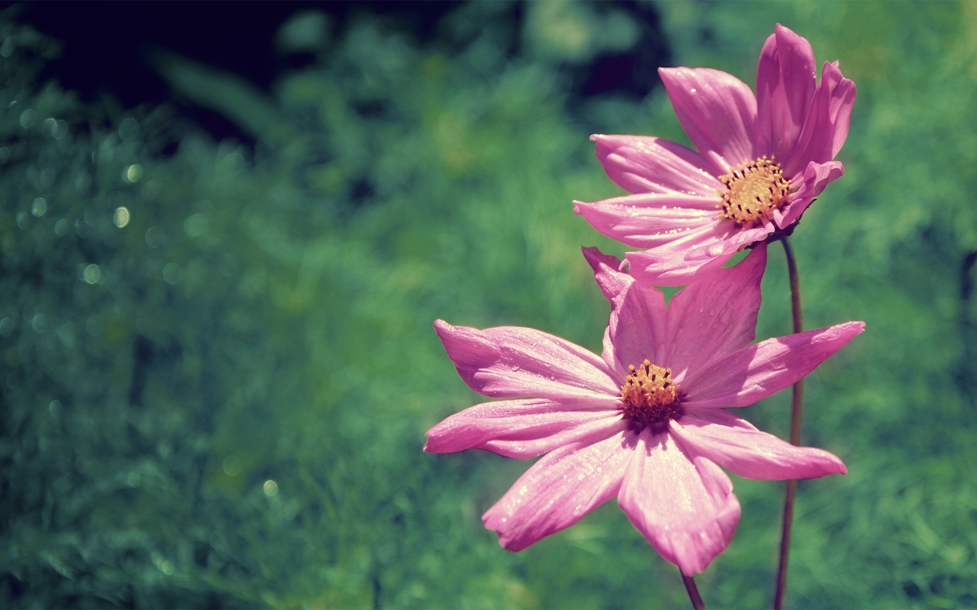Zwei rosa Blüten auf einem verschwommenen grünen Hintergrund