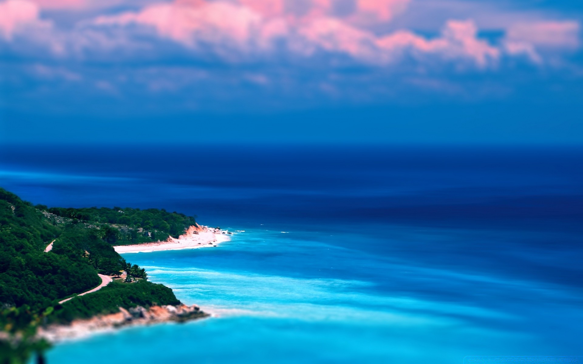 Inselparadies im Meer unter blauem Himmel mit rosa Wolken