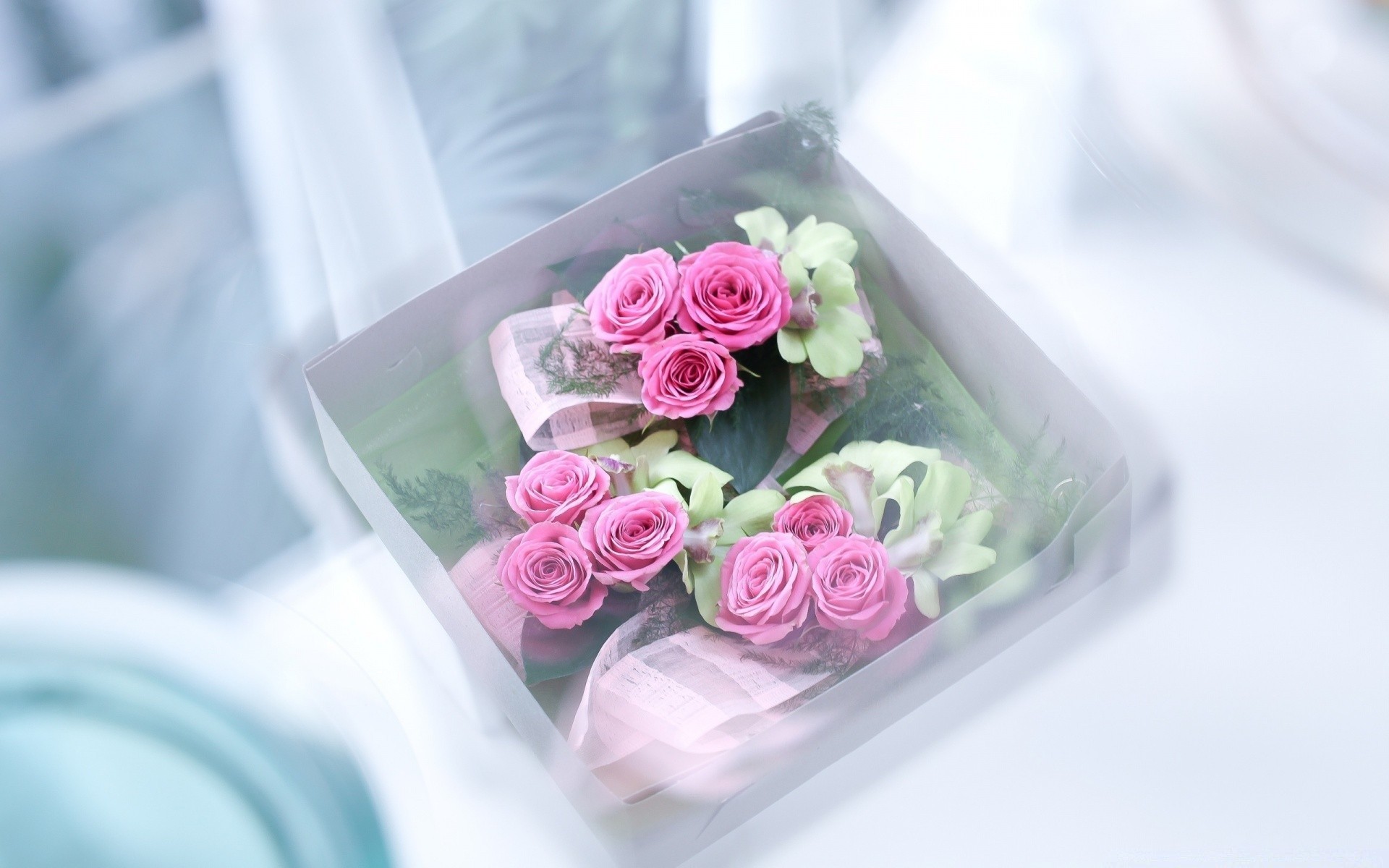 Rosa Rosen in einer Schachtel für eine Hochzeit