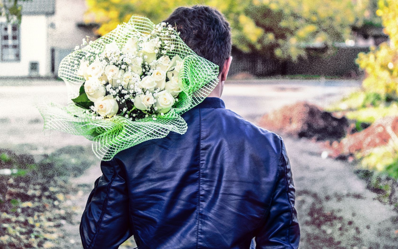 Hochzeitskleid für die Braut und ein Strauß weißer Rosen
