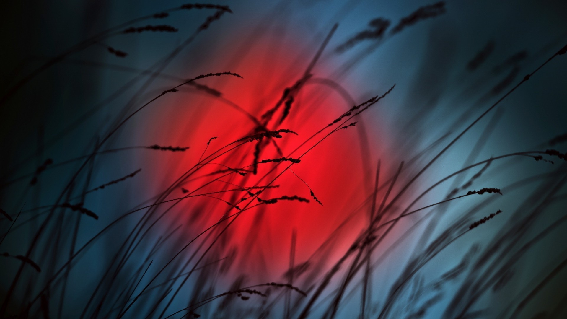 Die leuchtend rote Sonne blickt durch die Grashalme