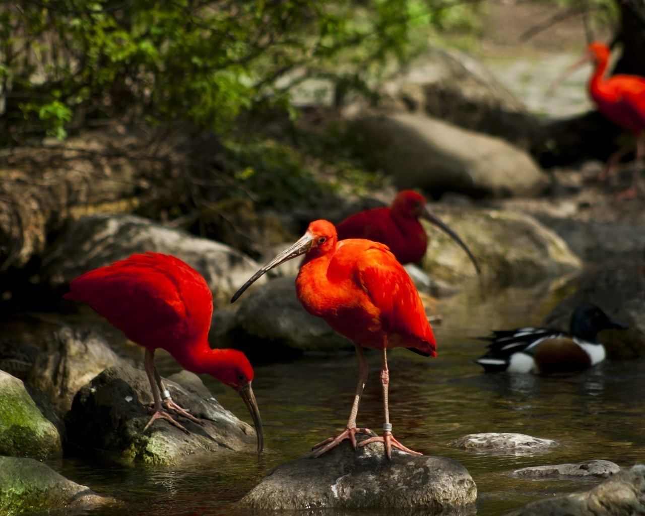 Schöne rote Vögel am Wasser