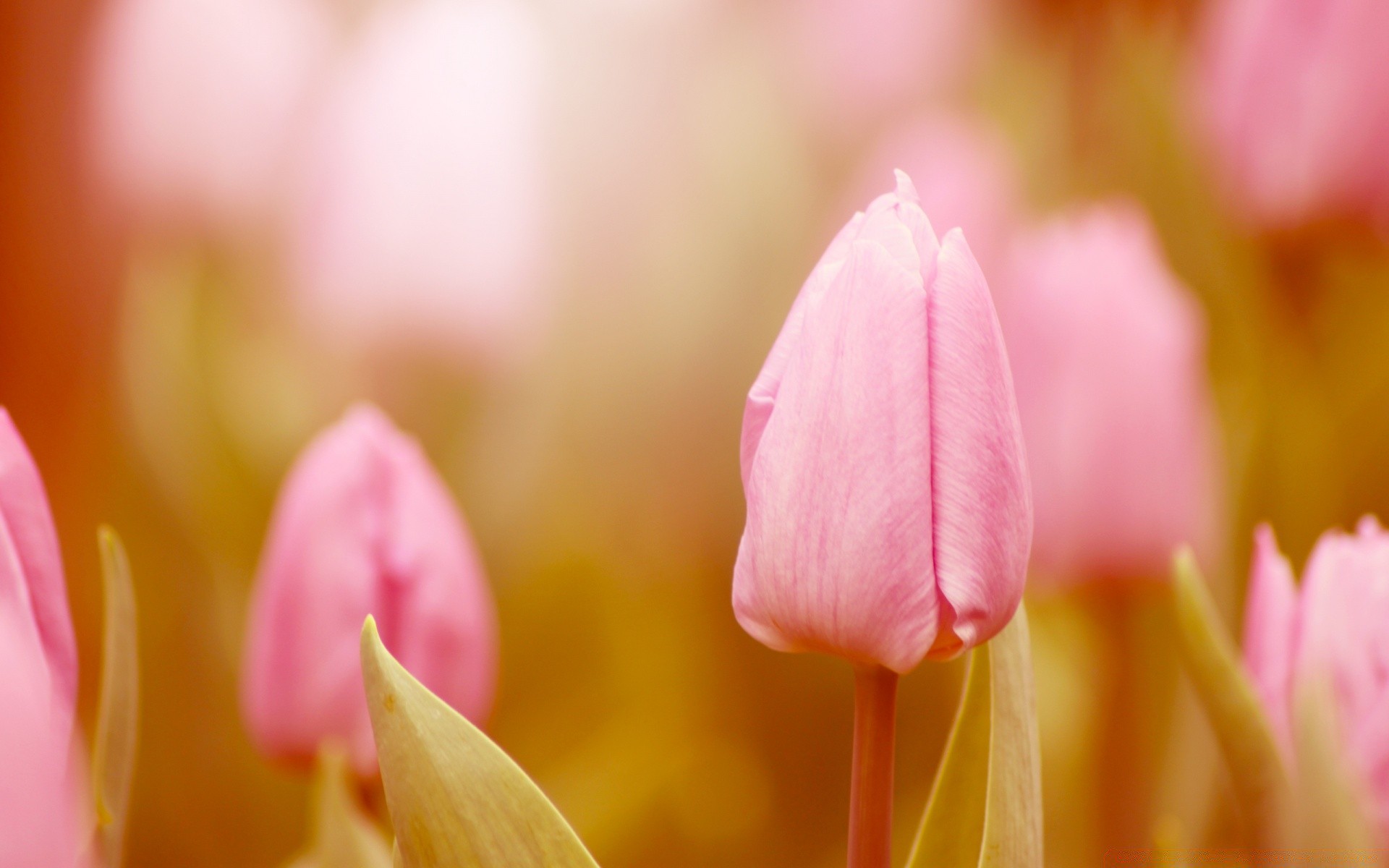 Rosa Tulpen. Blumenfeld bei Sonnenuntergang