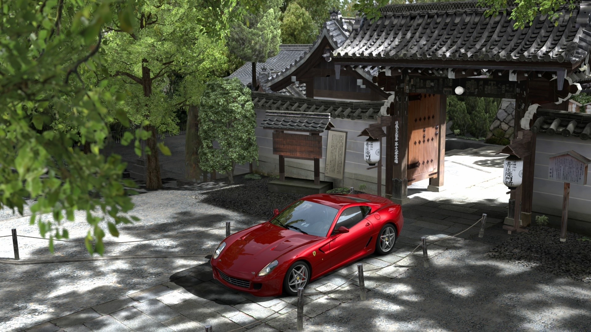 Ein roter Rennwagen steht neben einem offenen Tor