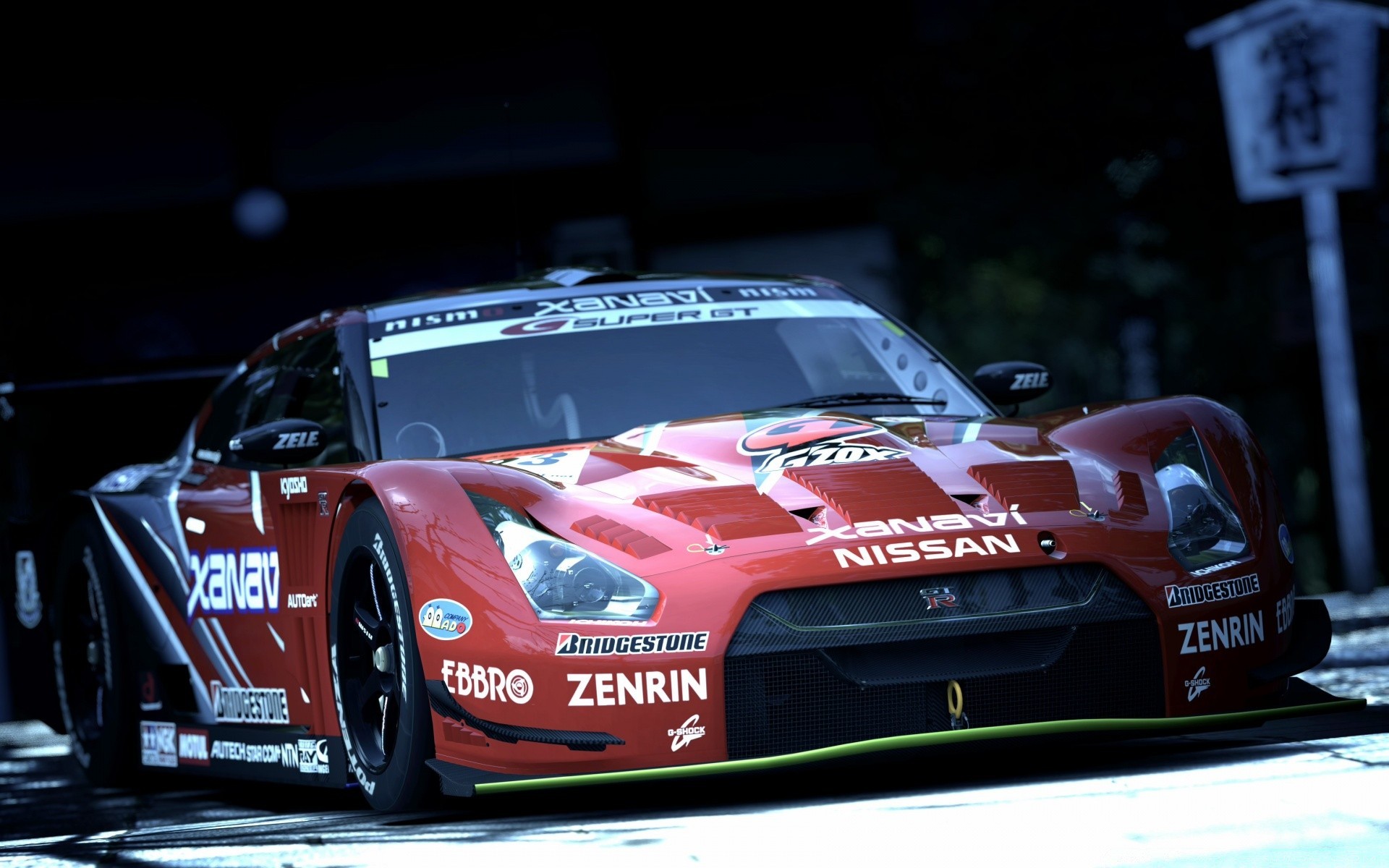 Ein roter Rennwagen steht neben einem offenen Tor