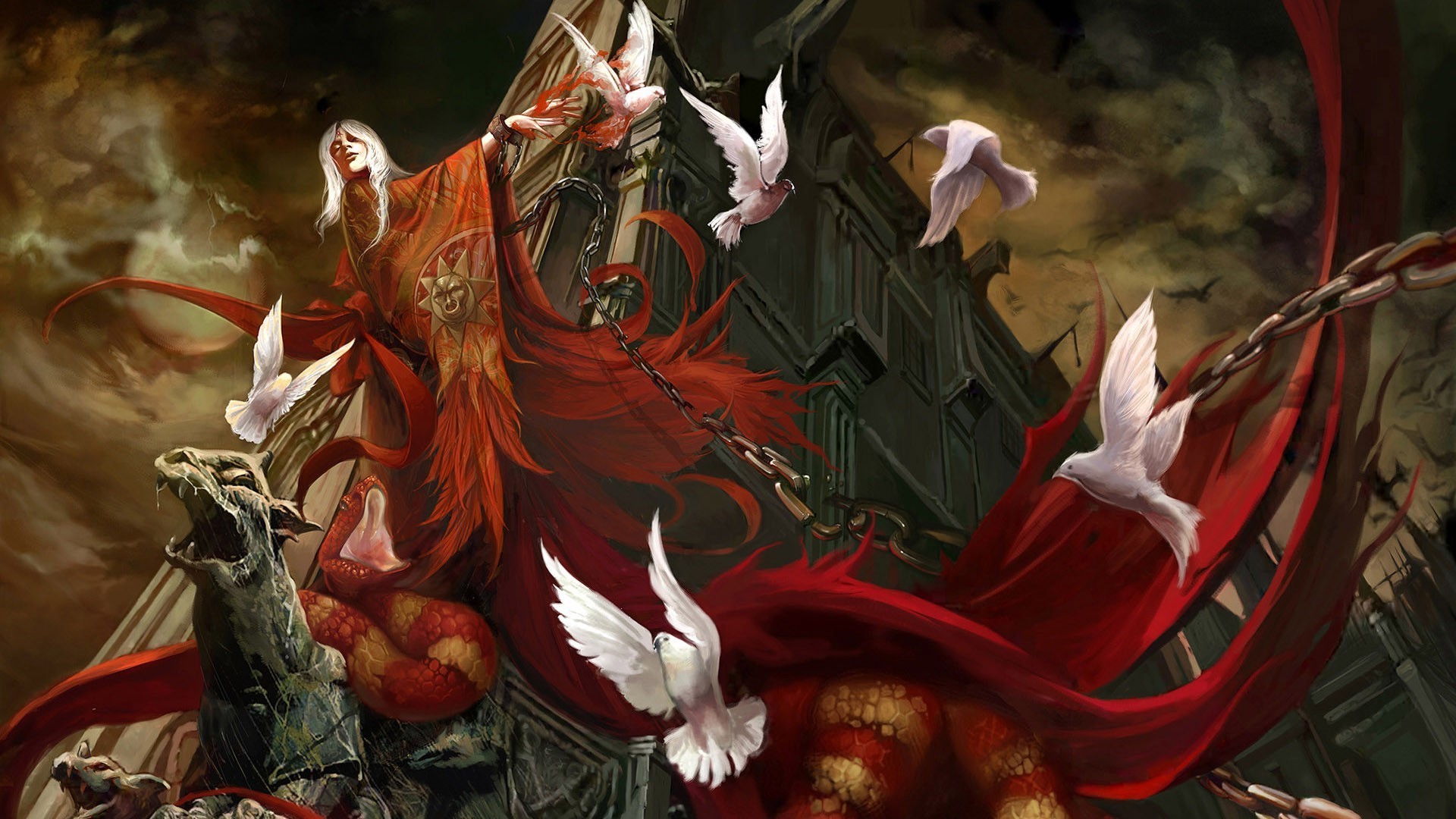 Die Hexe, die vom Zauberer in roter Kette gefesselt war, lächelte und gab ihren weißen Tauben ihre Strafe