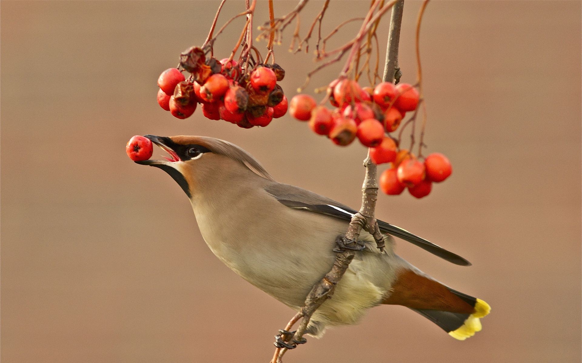 Beeren und Vögel. Vogel mit einem Viburnumzweig
